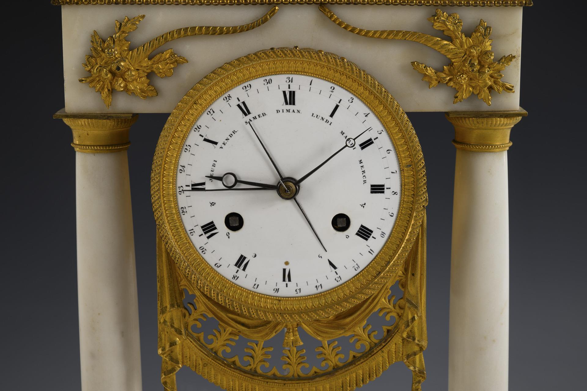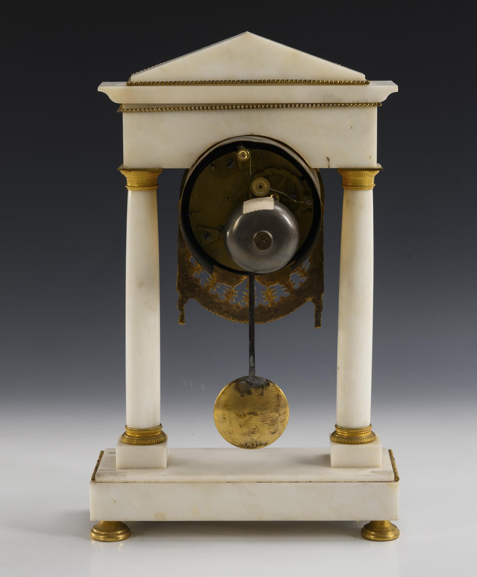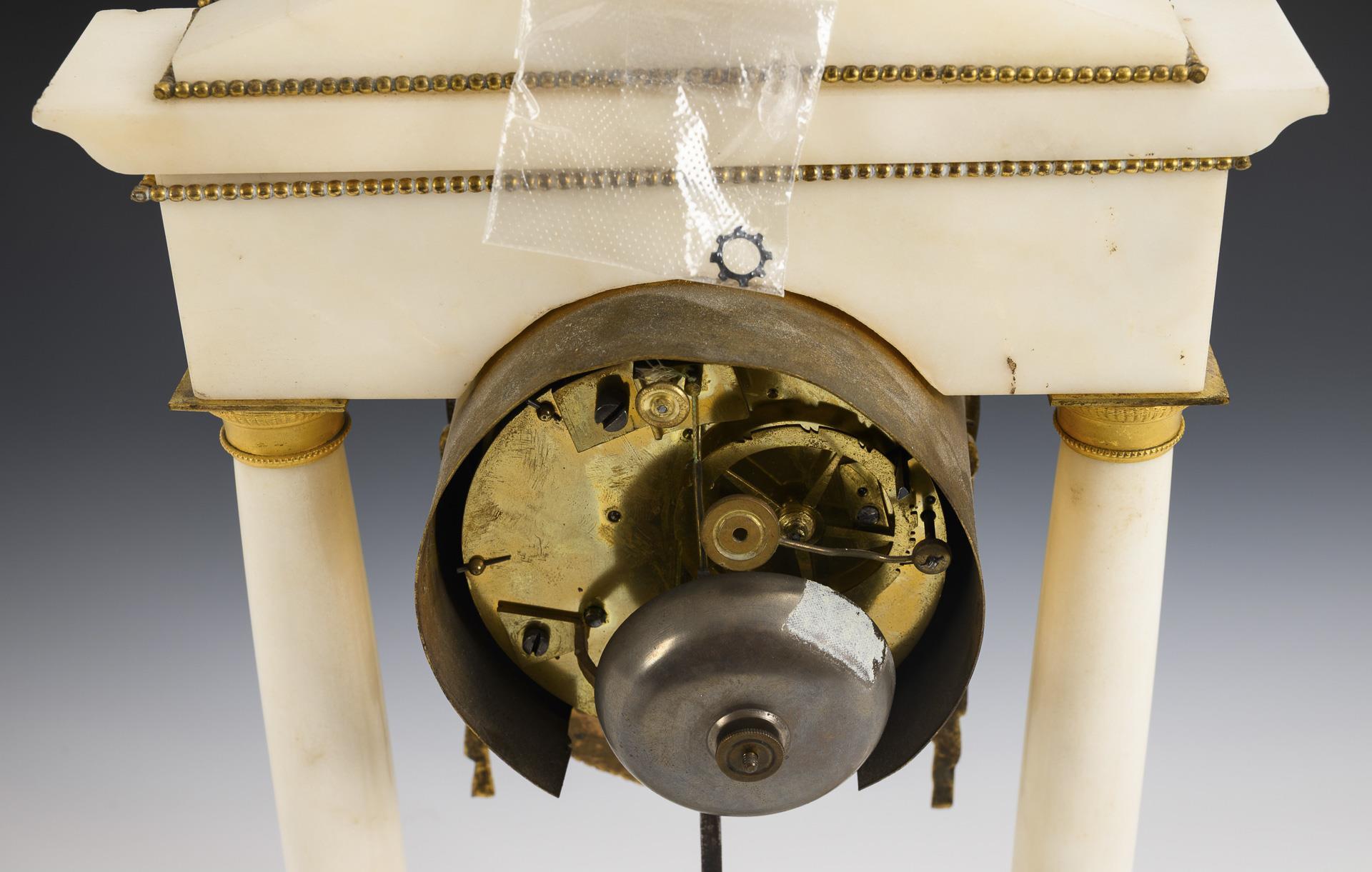 Säulenuhr mit hohem Gebälk und Dreiecksgiebel mit antikisierenden Beschlägen, hängender Draperie, auf schmalem Rechtecksockel mit 4 Scheibenfüßchen. Alters- und Gebrauchsspuren, partiell kleine Kantendefekte, Lötspuren am Pendel, Pendelfaden ergänzt, Stundenzeiger locker, 1 loses Rädchen anbei.