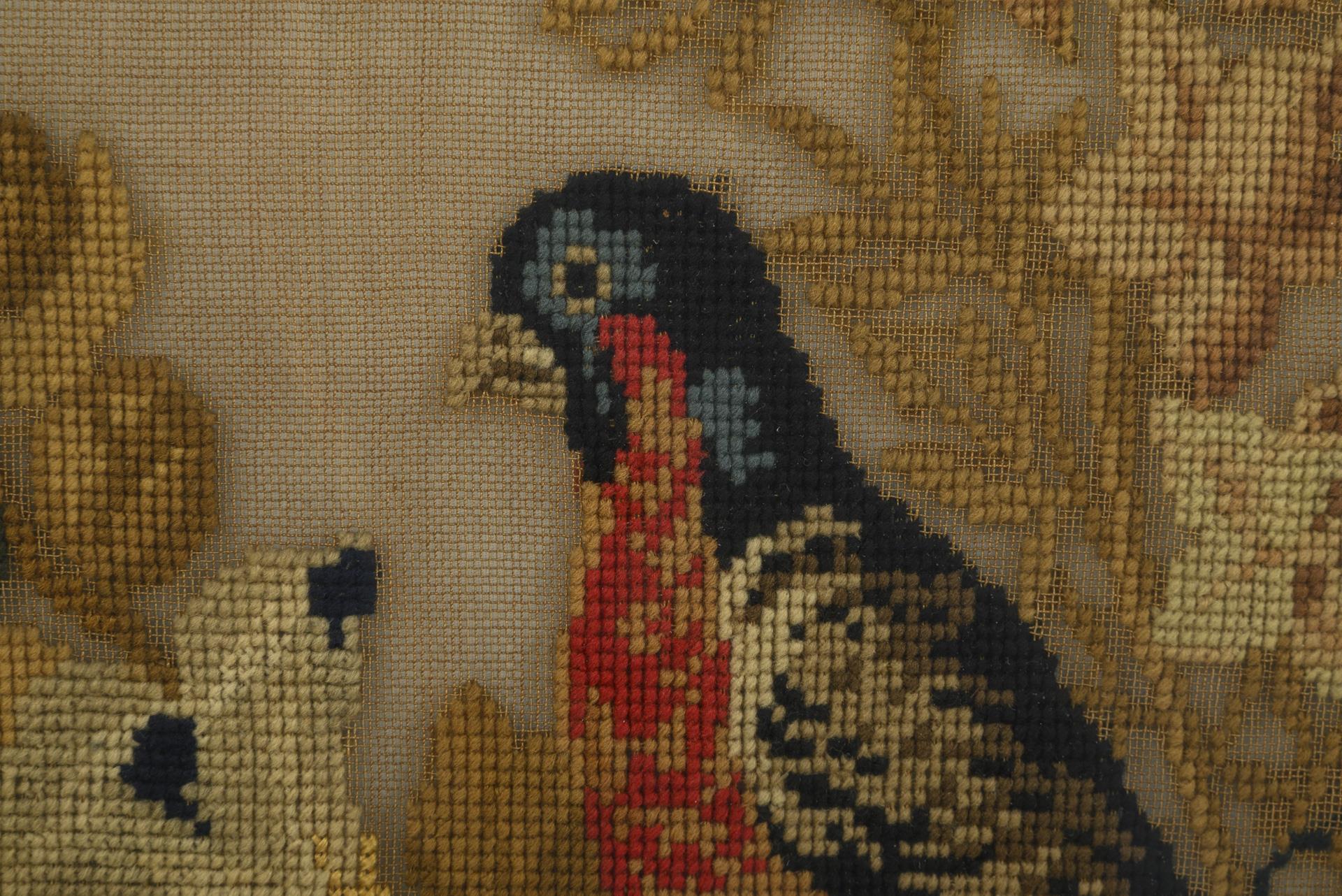 Spätbiedermeier-Kaminschirm mit gesticktem Papageienbild.