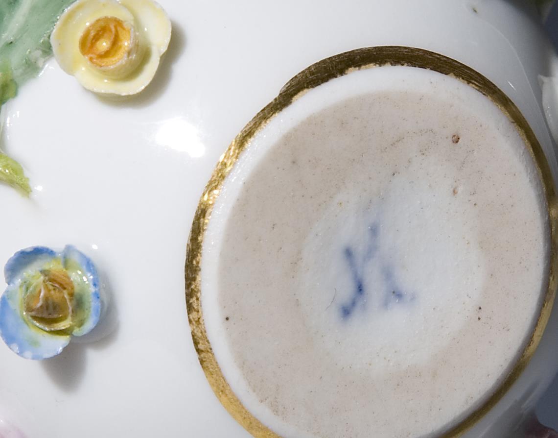 Allseits plastisch aufgelegte, naturalistisch bemalte Blüten. Gold staffierte Ränder. Originaler Stöpsel. Unglasierter Boden. Schwertermarke 1. Wahl. Wenige Blüten, Blätter bestoßen.