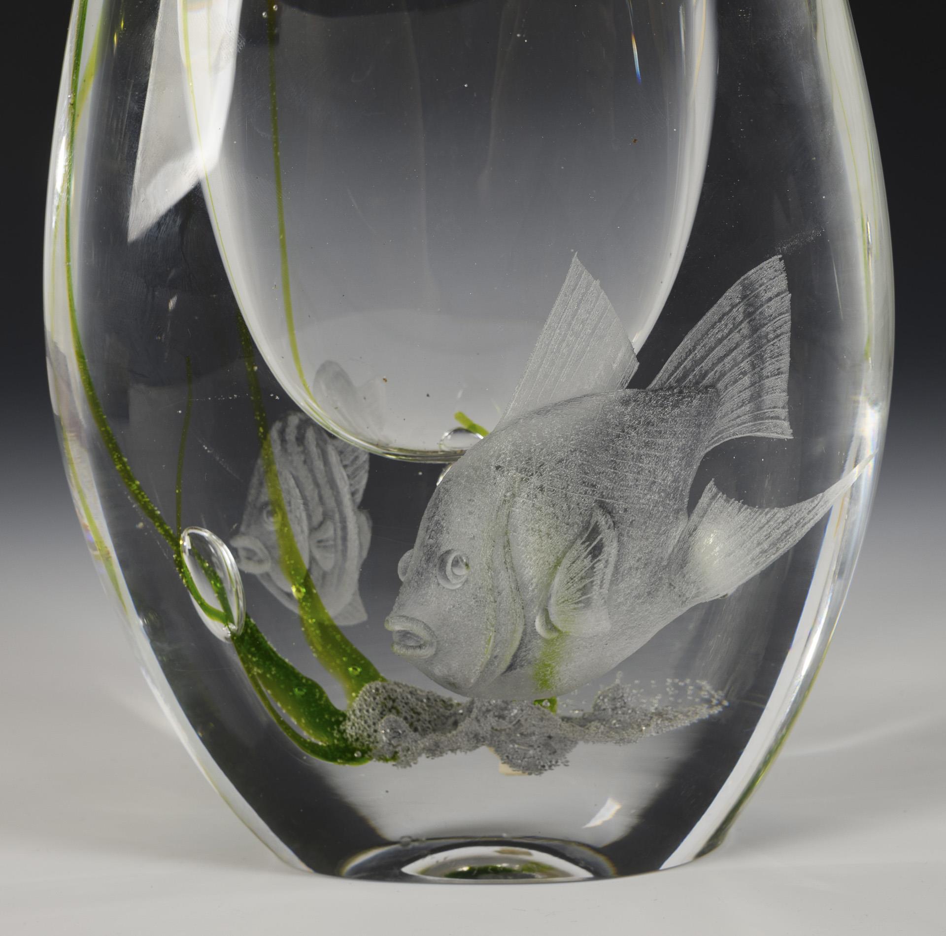 Ovoider, geplatteter Lampenfuß aus farblosem Glas mit tiefgeschnittenen Fischen, eingeschmolzenen grünen Glasschlieren und eingestochenen Luftblasen, Metallmontierung mit einer Lampenfassung. Weißer Kunststoffschirm. Elektrifiziert (Funktion nicht geprüft).