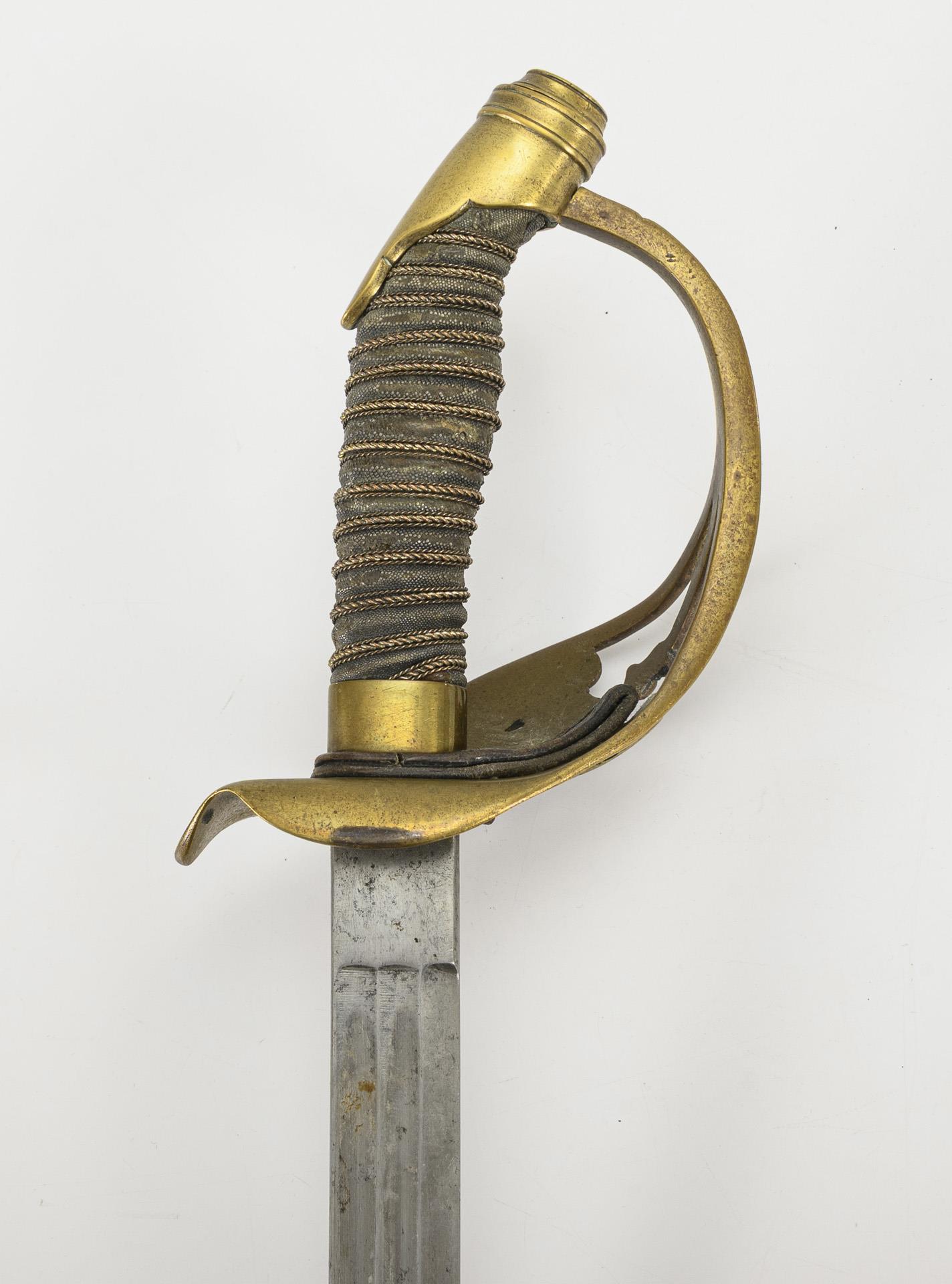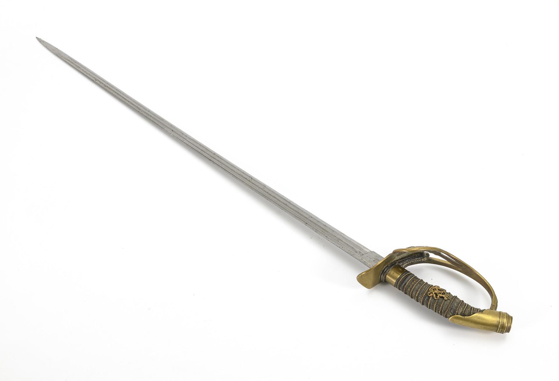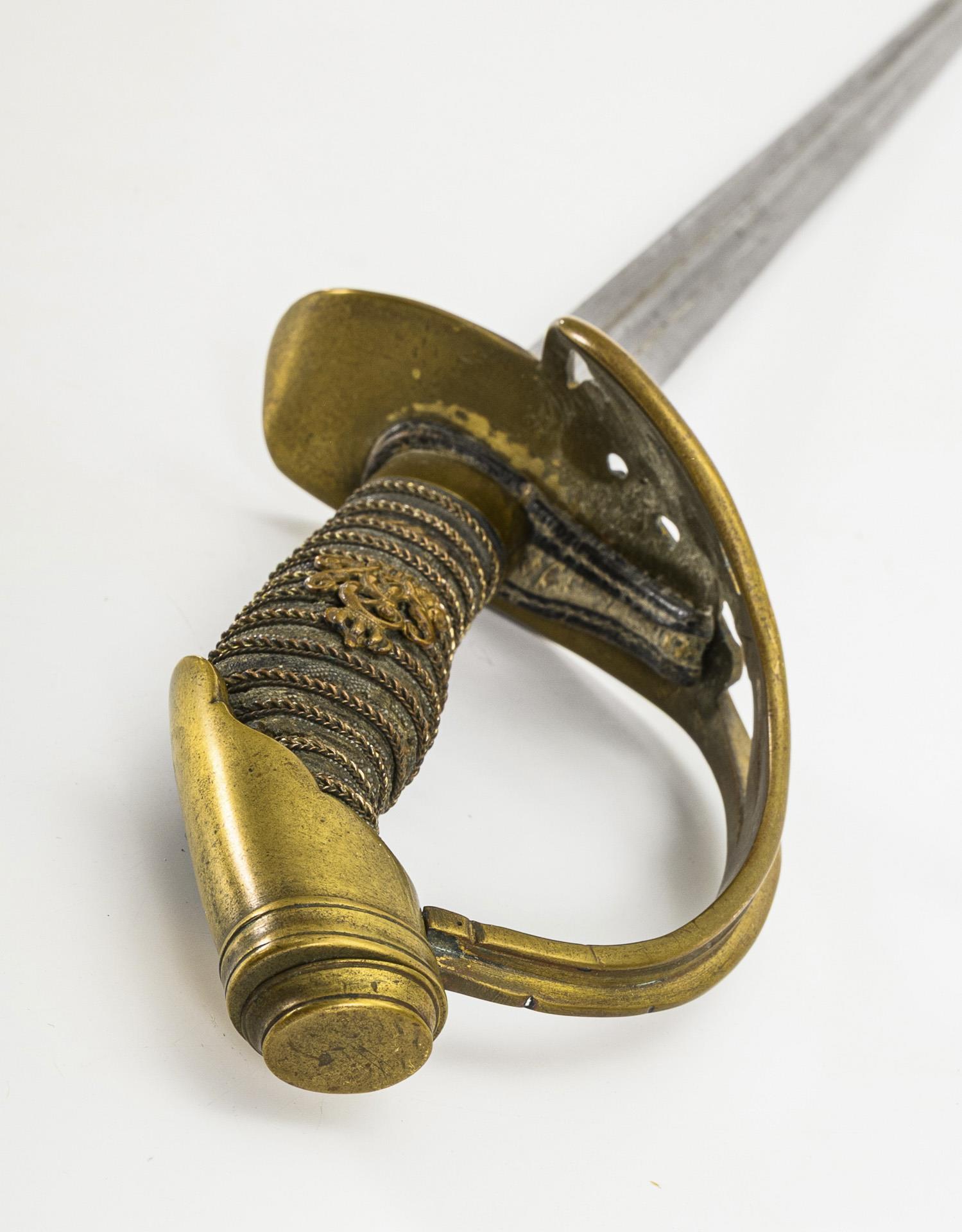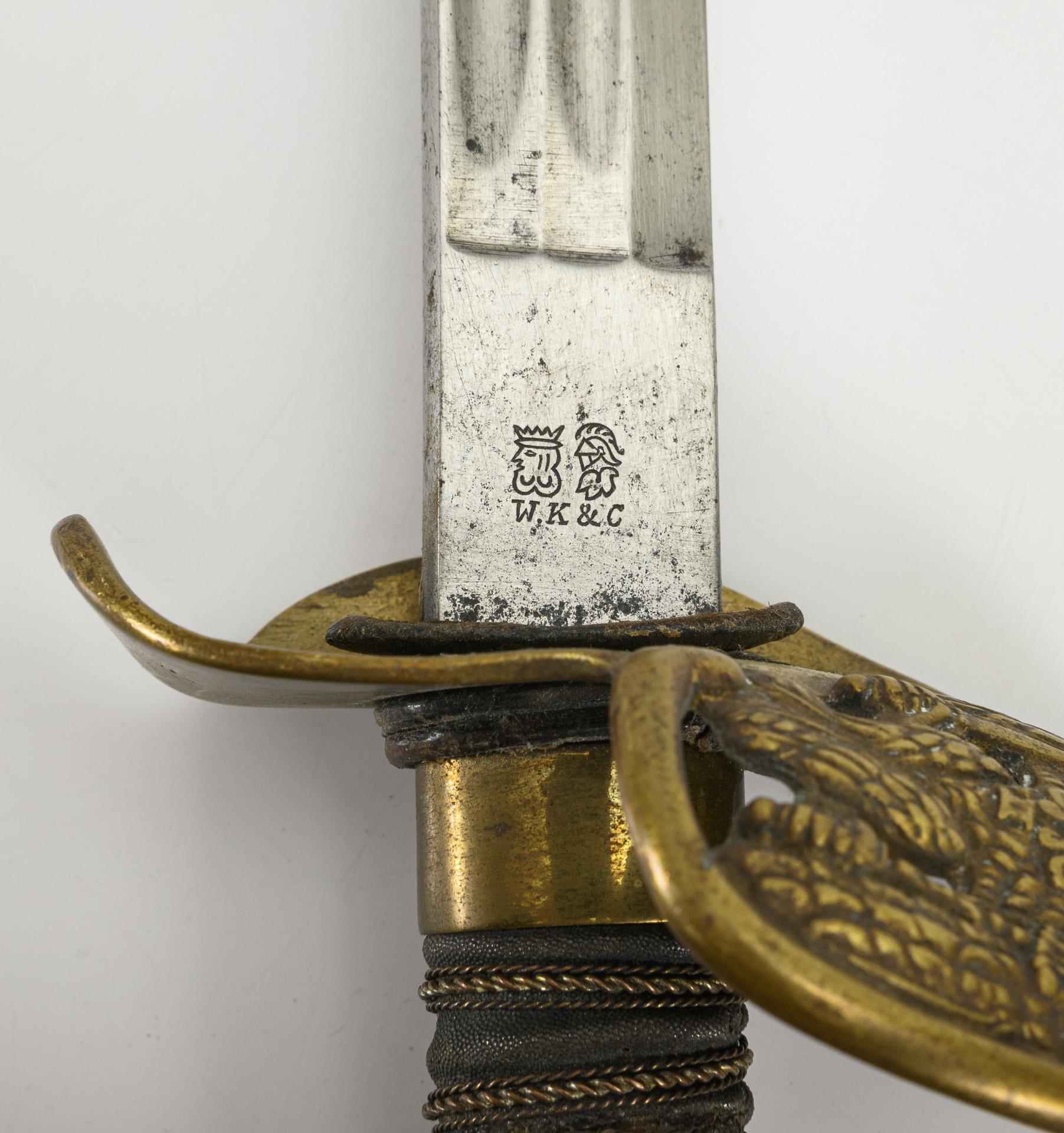 IOD mit gerader, einschneidiger Klinge und zwei schmalen Hohlschliffen. Dreispangiges Messinggefäß mit reliefiertem Adler und Monogramm "W II", dieses auch als Applik auf dem Fischhautgriff mit Drahtwicklung. Lederne Daumenschlaufe.