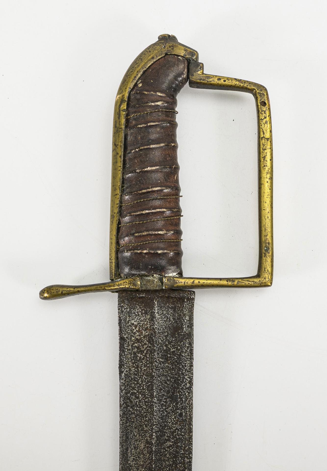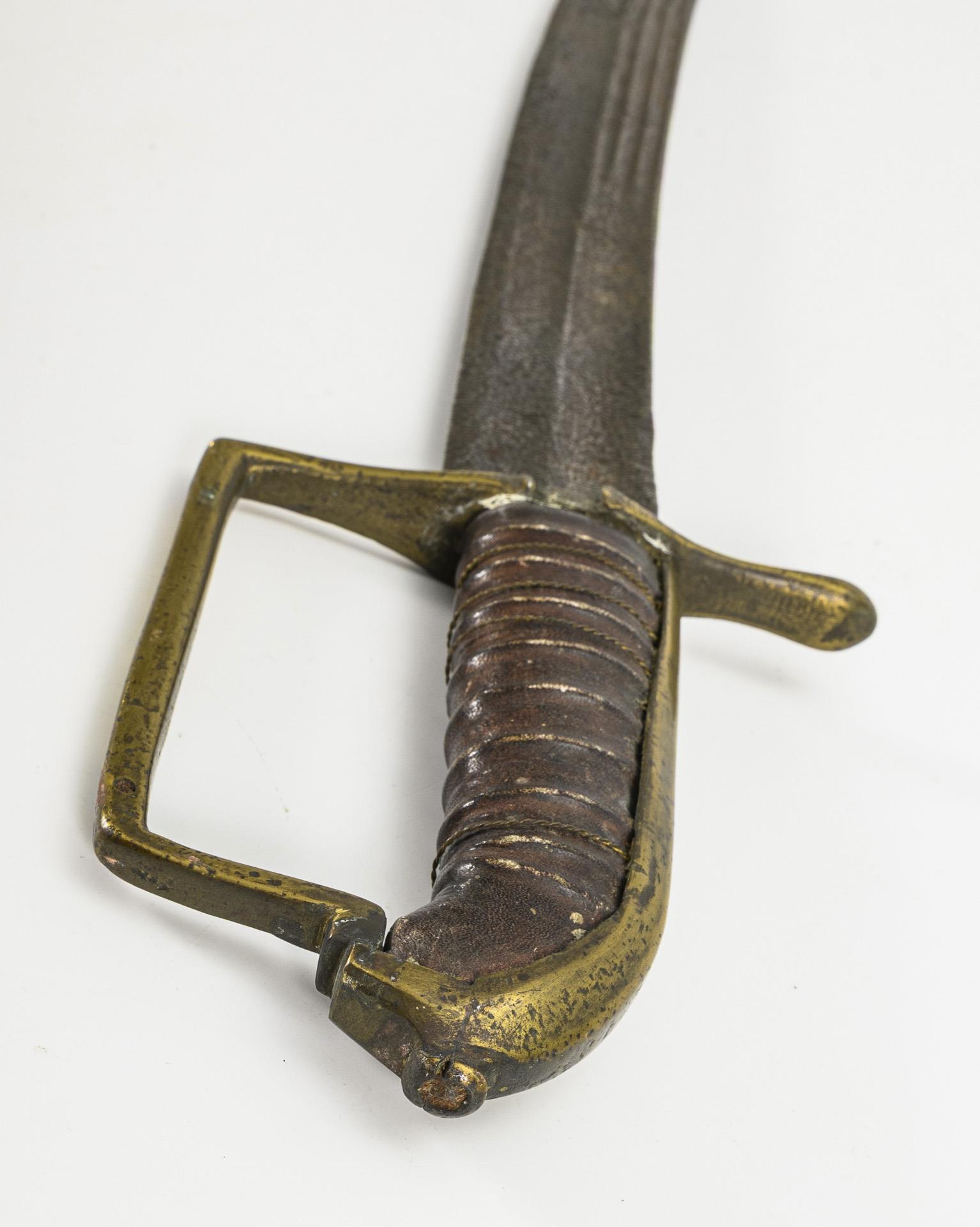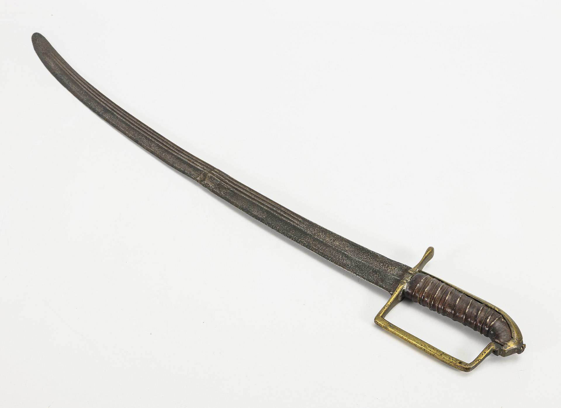 Gekrümmte, einschneidige Klinge mit breitem Hohlschliff und drei schmalen Hohlschliffen unterhalb des Rückens. Klinge mittig wohl geschweißt, mit starken Korrosionsnarben. Messinggriff mit fehlendem Mitteleisen. Kantiges Messinggefäß mit Ledergriff und Resten der Drahtwicklung. Starke Alters- und Gebrauchsspuren.