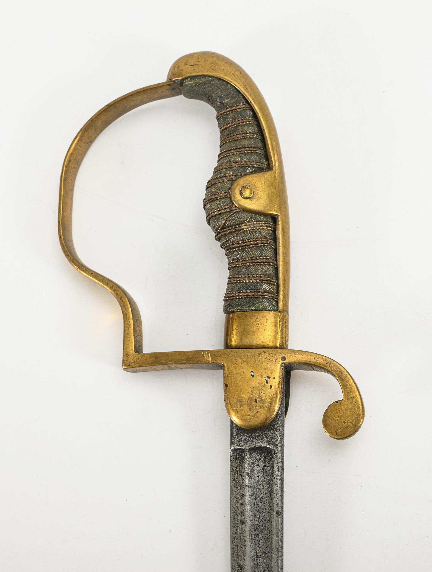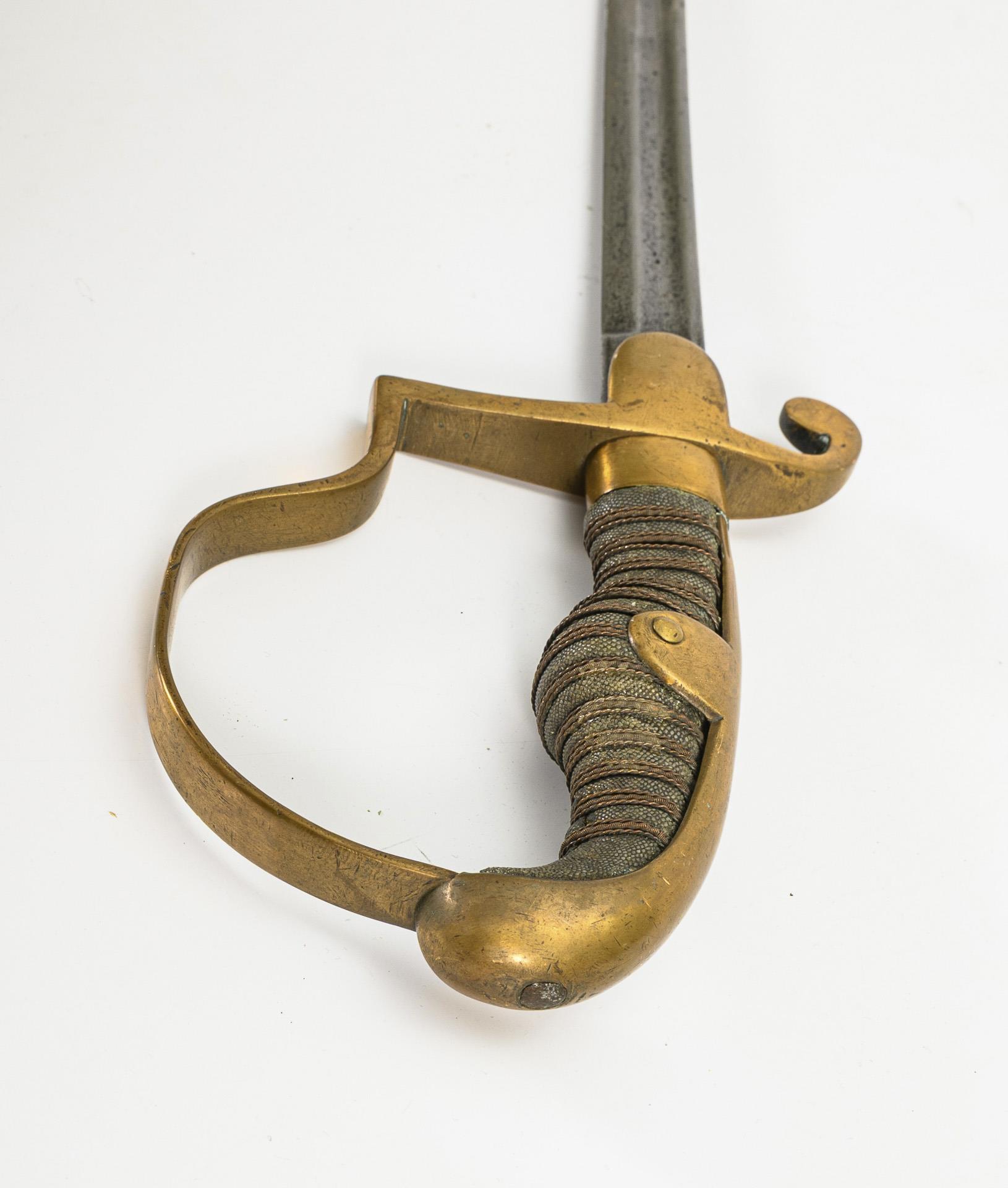 Schmale einschneidige, leicht gekrümmte Klinge mit Hohlschliff. Einfaches Messinggefäß, Griff mit Fischhaut und etwas loser Drahtwicklung. Schwarze Metallscheide mit Korrosion passt, aber nicht dazugehörig. Klinge mit Korrosionsnarben.