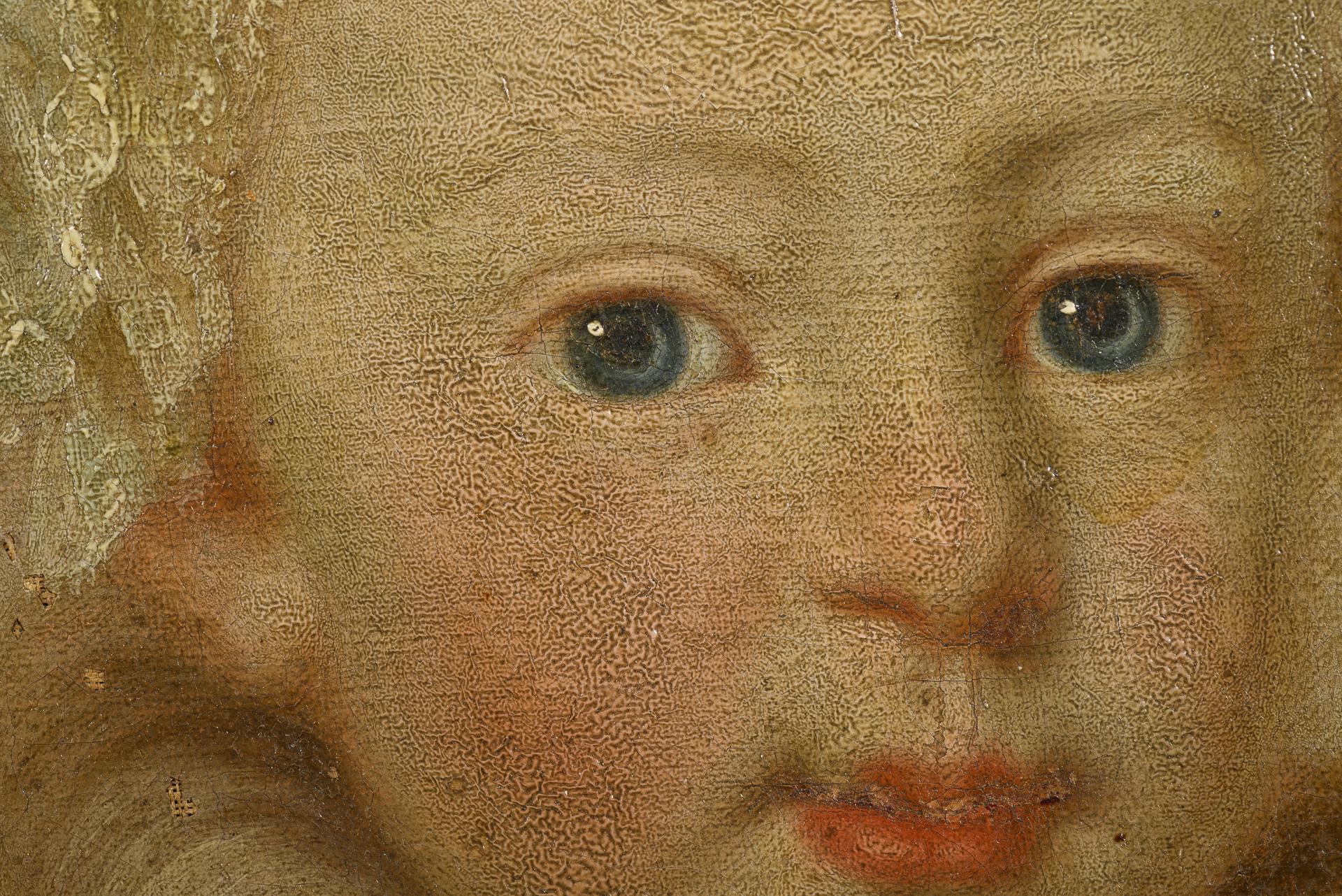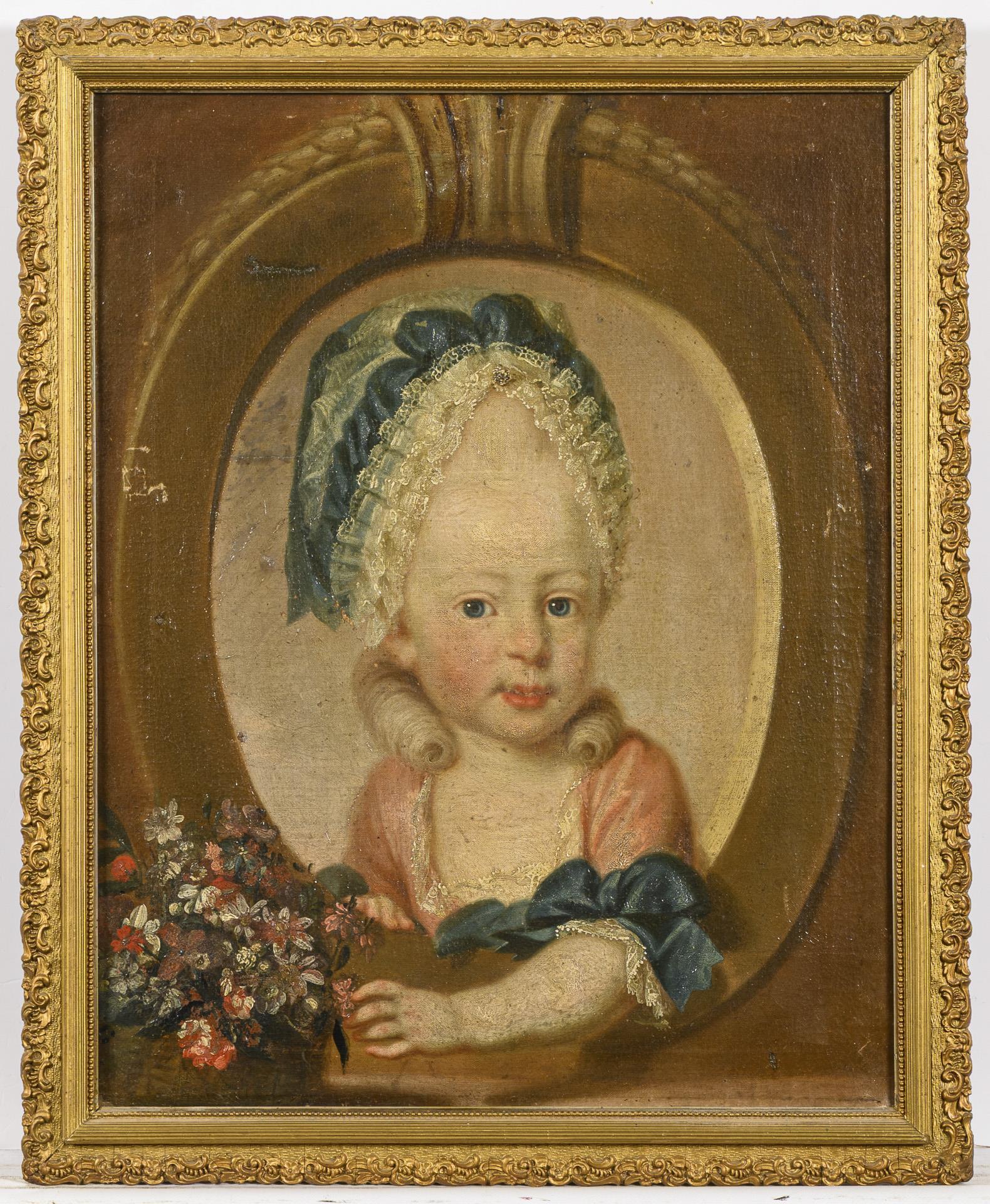 Porträt eines kleinen Mädchens mit großer Allongeperücke in oval gemaltem Rahmen mit Blumenstrauß. Restaurierungsbedürftig.