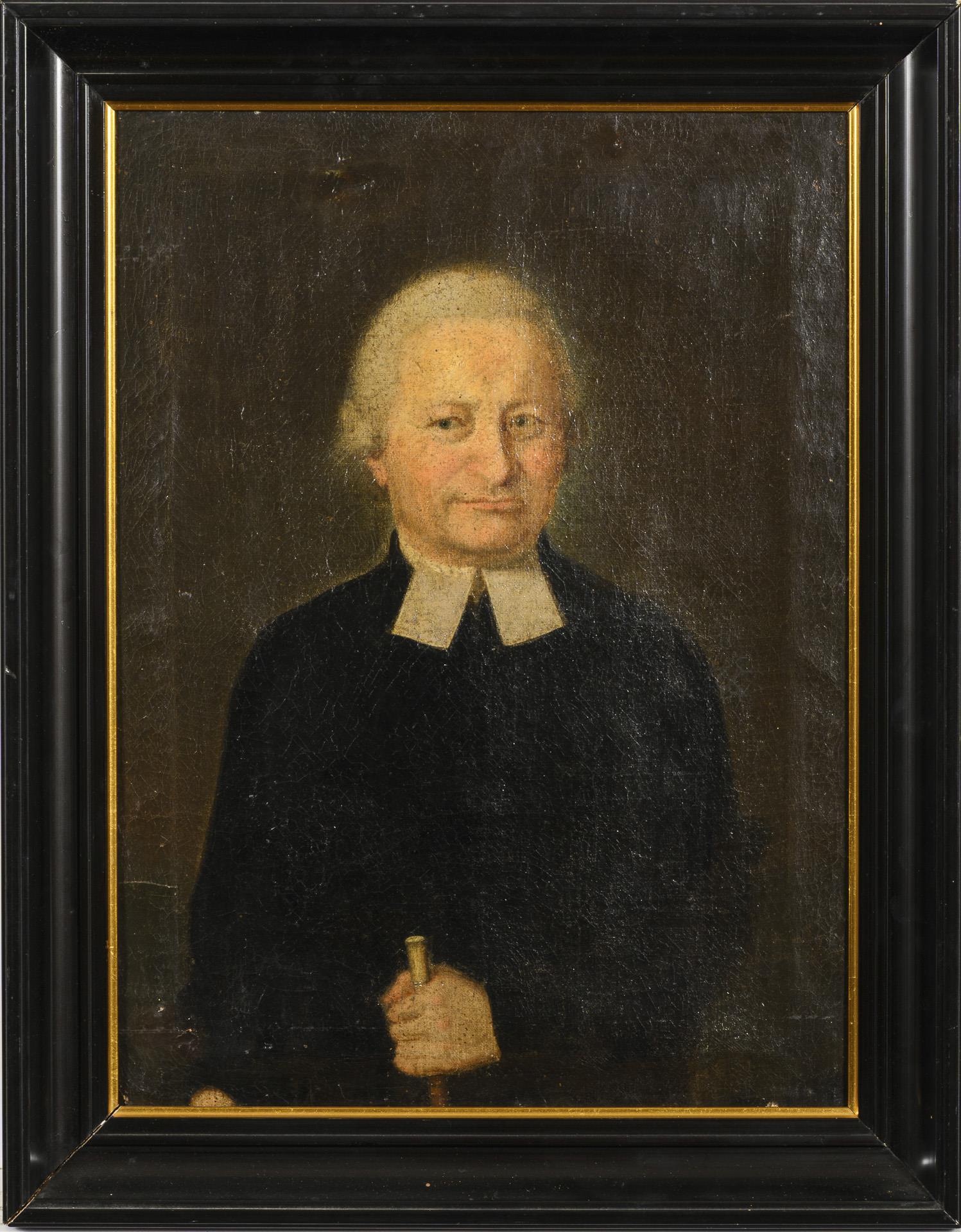 Porträt eines älteren Mannes mit weißer Zopfperücke und im schwarzen Gewand. Zwei kleine restaurierte Stellen mit Hinterklebungen.