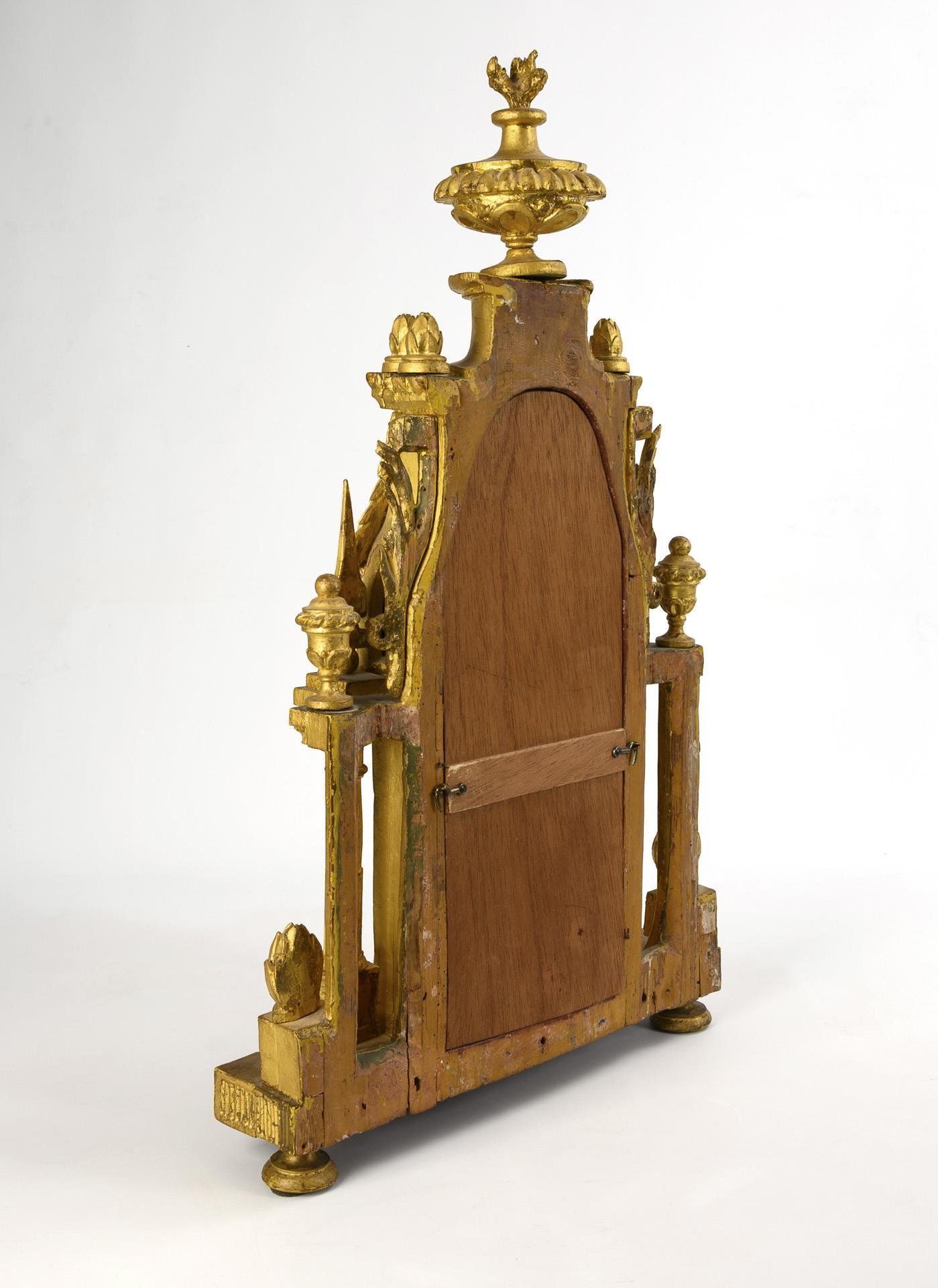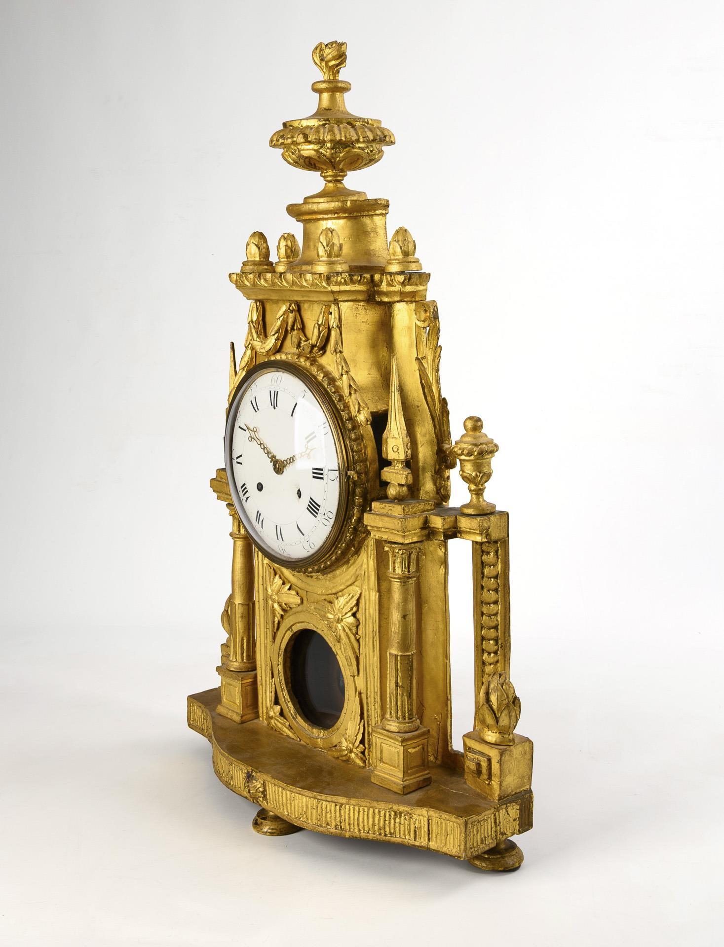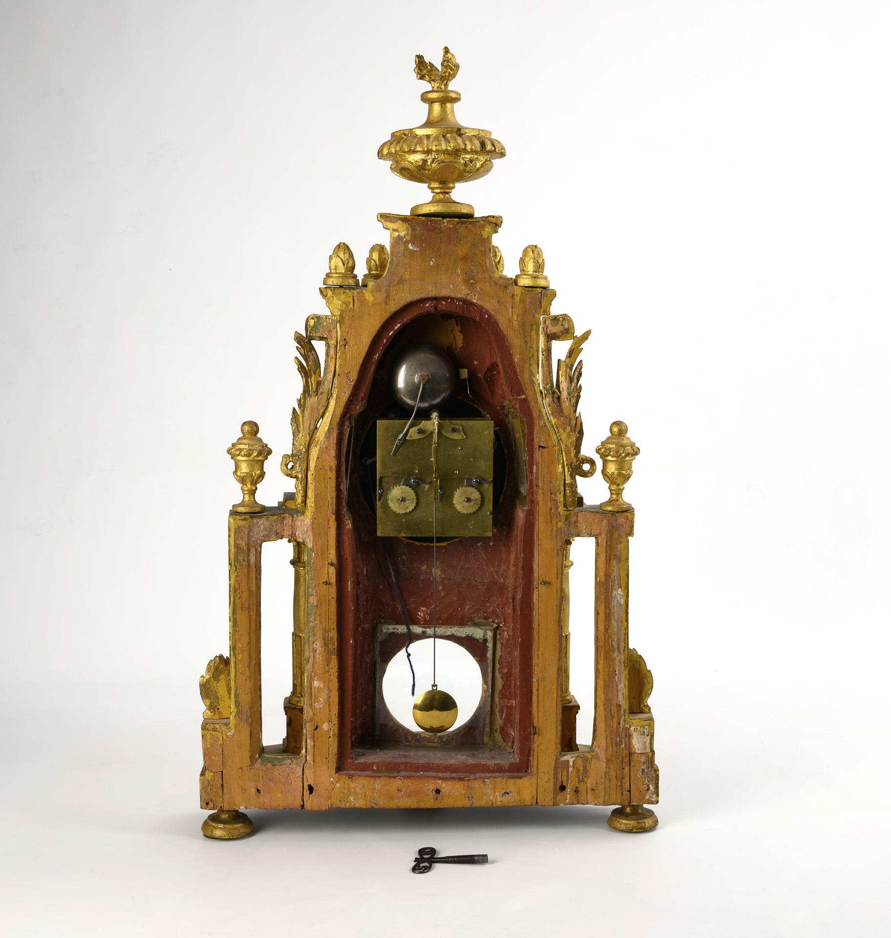 Flaches architektonisches Gehäuse im neoklassizistischen Stil mit aufgesetzter Urnenbekrönung, Festons, seitlichen Säulen, Zapfen und Blattwerk, Pendelsichtfenster, auf konvexem Sockel mit 3 Scheibenfüßen, 2 Füße fehlend. Ziffernblatt mit Defekten, Gehäuse mit Rissen, Alters- und Gebrauchsspuren, inaktiver Anobienbefall, Rückwand jünger ergänzt, angesteckte Elemente teils lose.