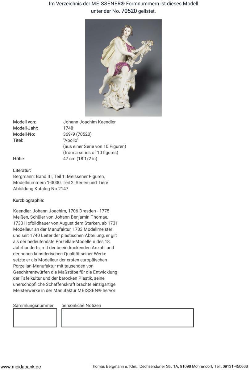 Meissen-Manufaktur-Preis: 15500,- Euro. Kaendler: "Den Apollo Von Ziemlicher größe auf den Von Ihro Königl. Majt. In Preußen bestellten Porcelläin ofen im Modell zerschnitten und zum abformen gegeben." "Apollo den Gott der Musen in seiner schönen Gestallt mit Lorber Blättern gekrönet und ein Gewändlein über die Brust habend modelliret" * Partnerauktion Bergmann.