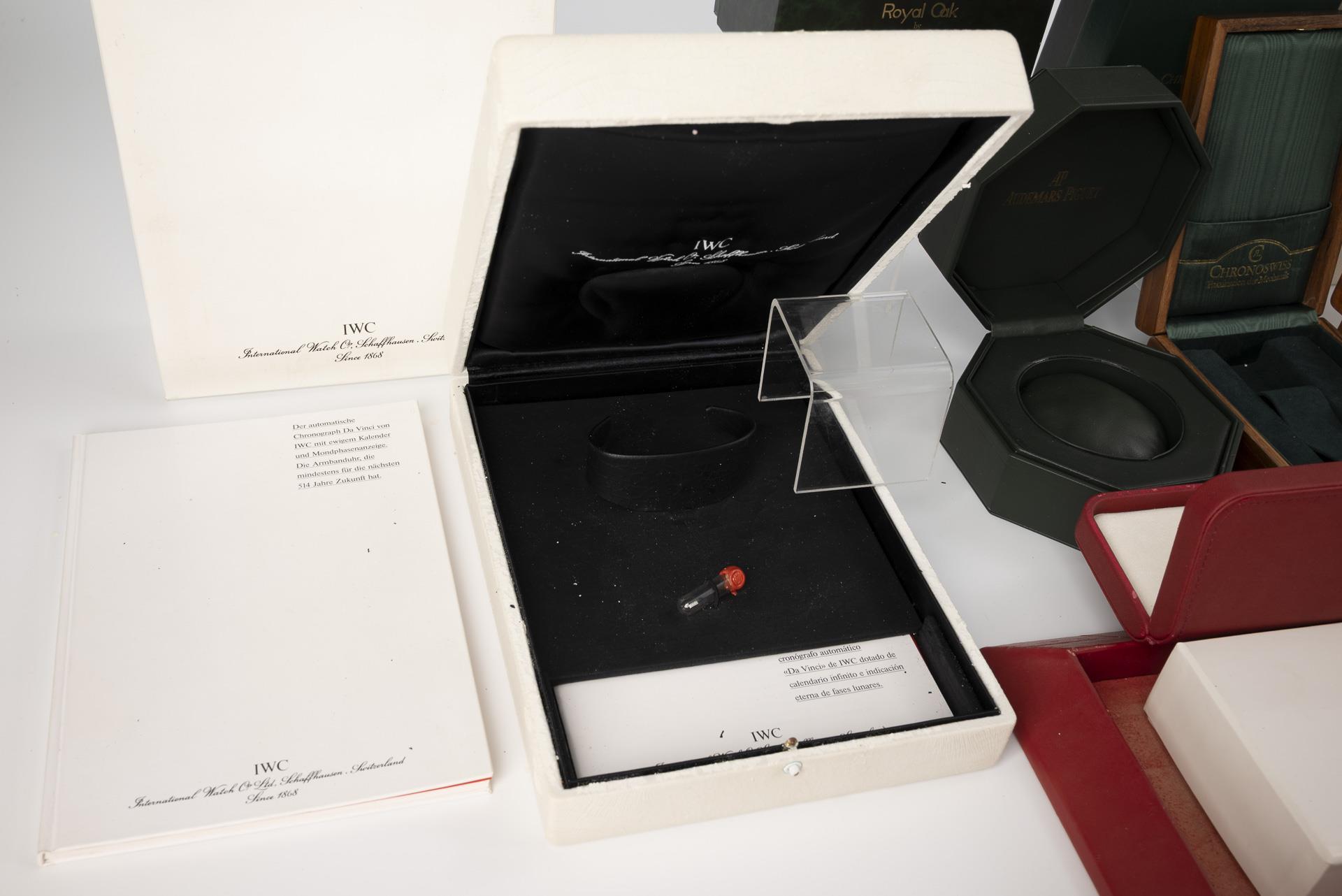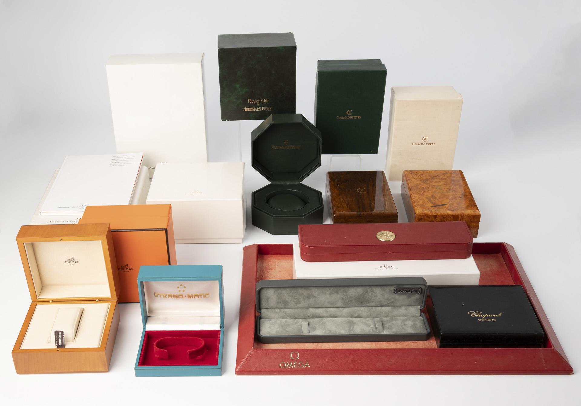 Rotes Omega-Etui in weißer Box, weiße Omega-Box, braunes Hermès-Holzetui mit Papieren in orangefarbener Box, 2 Chronoswiss-Holzetuis in weißer und grüner Box, graues Rado-Etui, schwarzes Chopard-Etui, blaues Eterna-Matic-Etui, dunkelgrünes oktogonales Audemars Piguet-Etui in Box, weißes IWC-Etui für automatischen Chronograph Da Vinci mit Buch und Gebrauchsanweisung in Karton. Dazu ein Omega-Verkaufstablett als Rechteckplatte mit geschrägten und mit rotem Leder verkleideten Seiten. Alle Etuis und Boxen ohne Uhren. Alters- und Gebrauchsspuren, IWC-Etui mit starken Zersetzungsspuren.