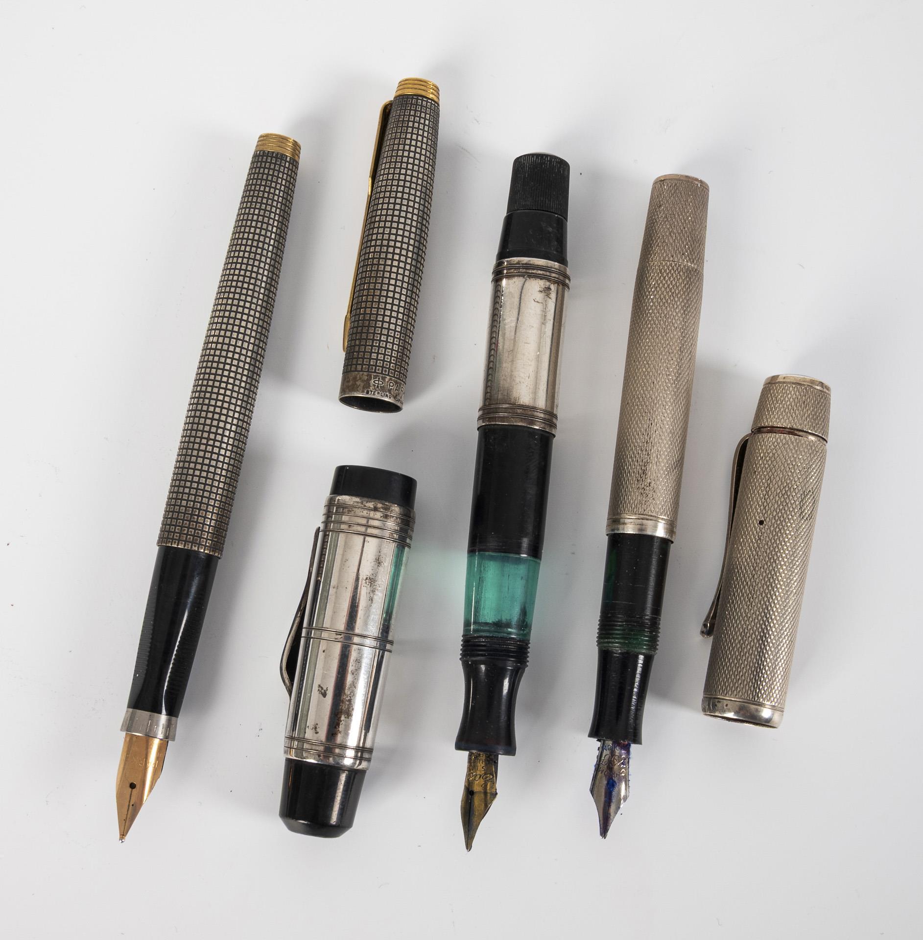 9 Schreibgeräte mit Silberhüllen: eine einzelne, leere Hülle, ein Jugendstil-Bleistifthalter, 2 Druckbleistifte, 2 Kugelschreiber, 3 Füller. Ein Kugelschreiber mit der Anlassgravur "10 Jahre in der Kaufhof Familie". Altersgemäße Gebrauchsspuren, vor allem Dellen.