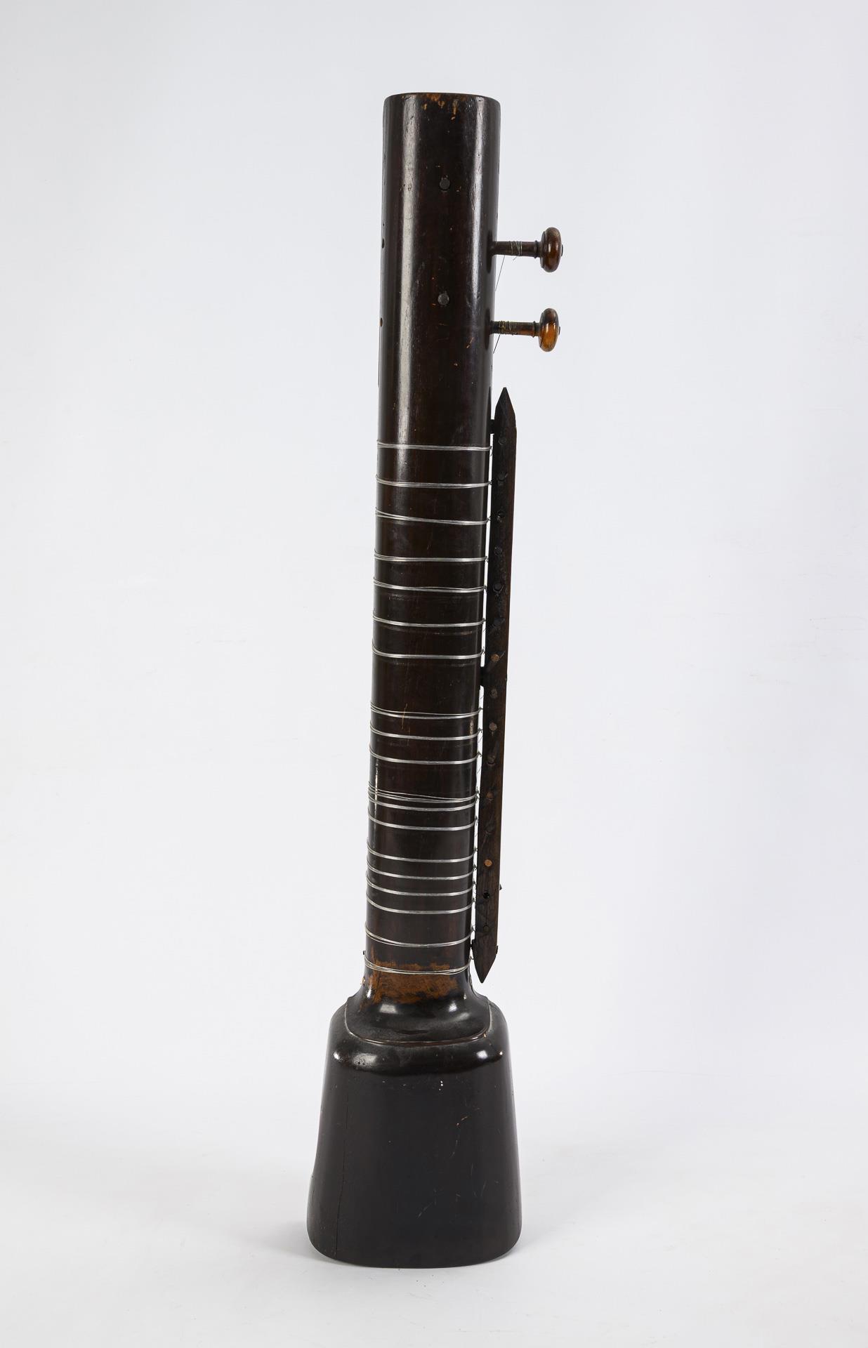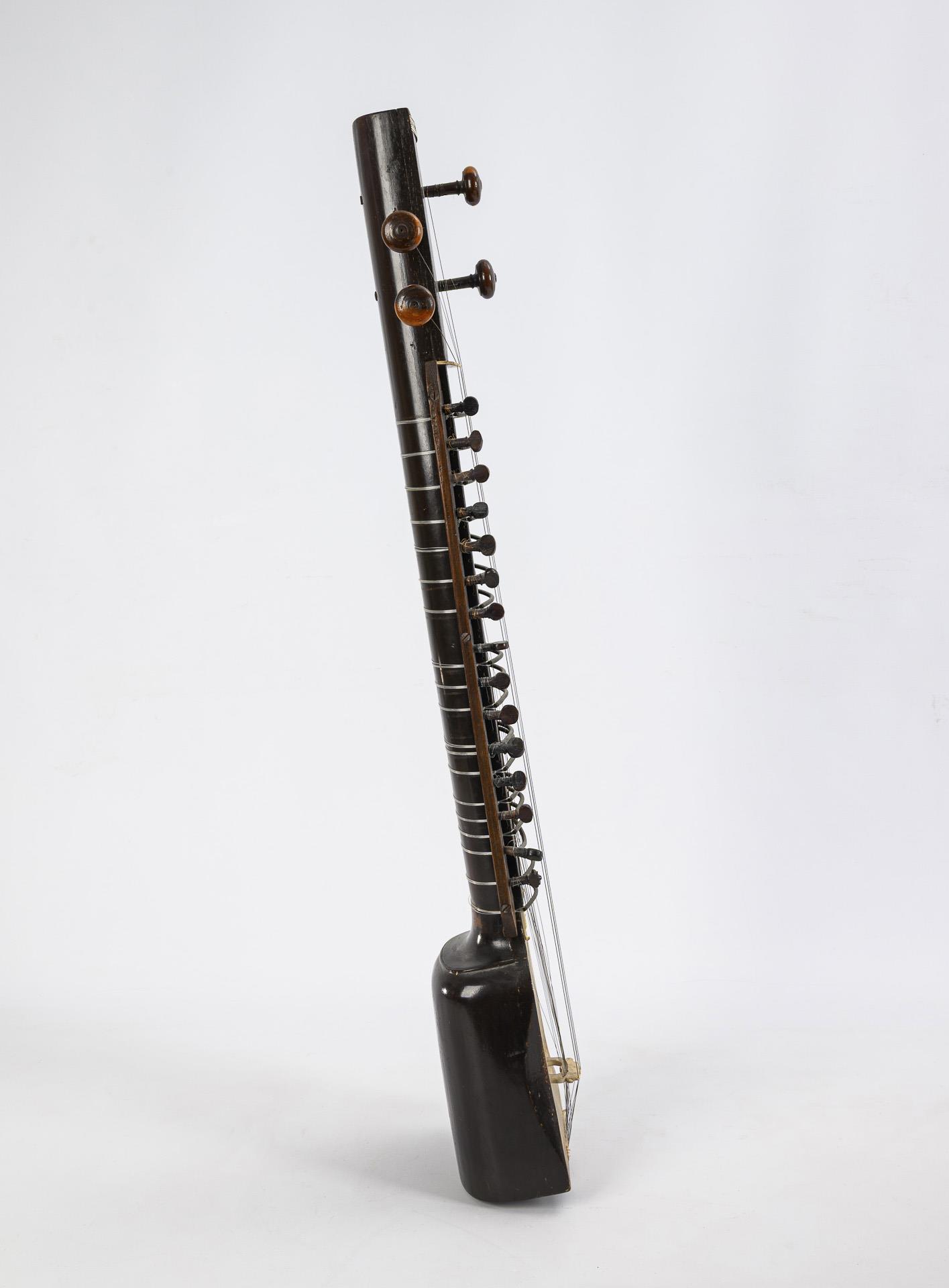 Vor allem in der traditionellen Musik Nordindiens und Pakistans sowie der religiösen Musik der Sikhs genutztes Saiteninstrument. Seitlich mit 15 Befestigungen für Resonanzsaiten, mit beiliegendem gaz (Bogen). Alters- und Gebrauchsspuren.