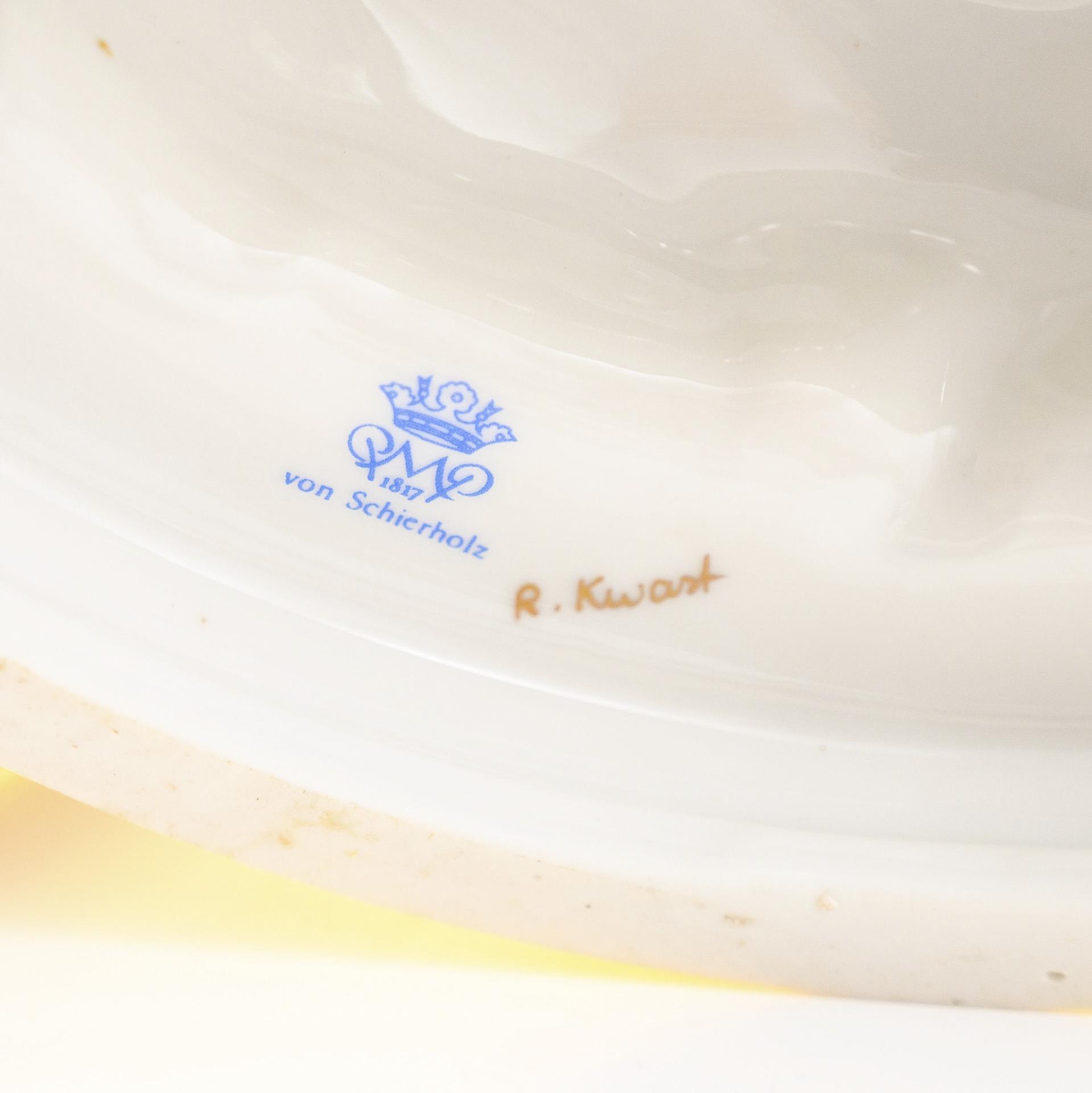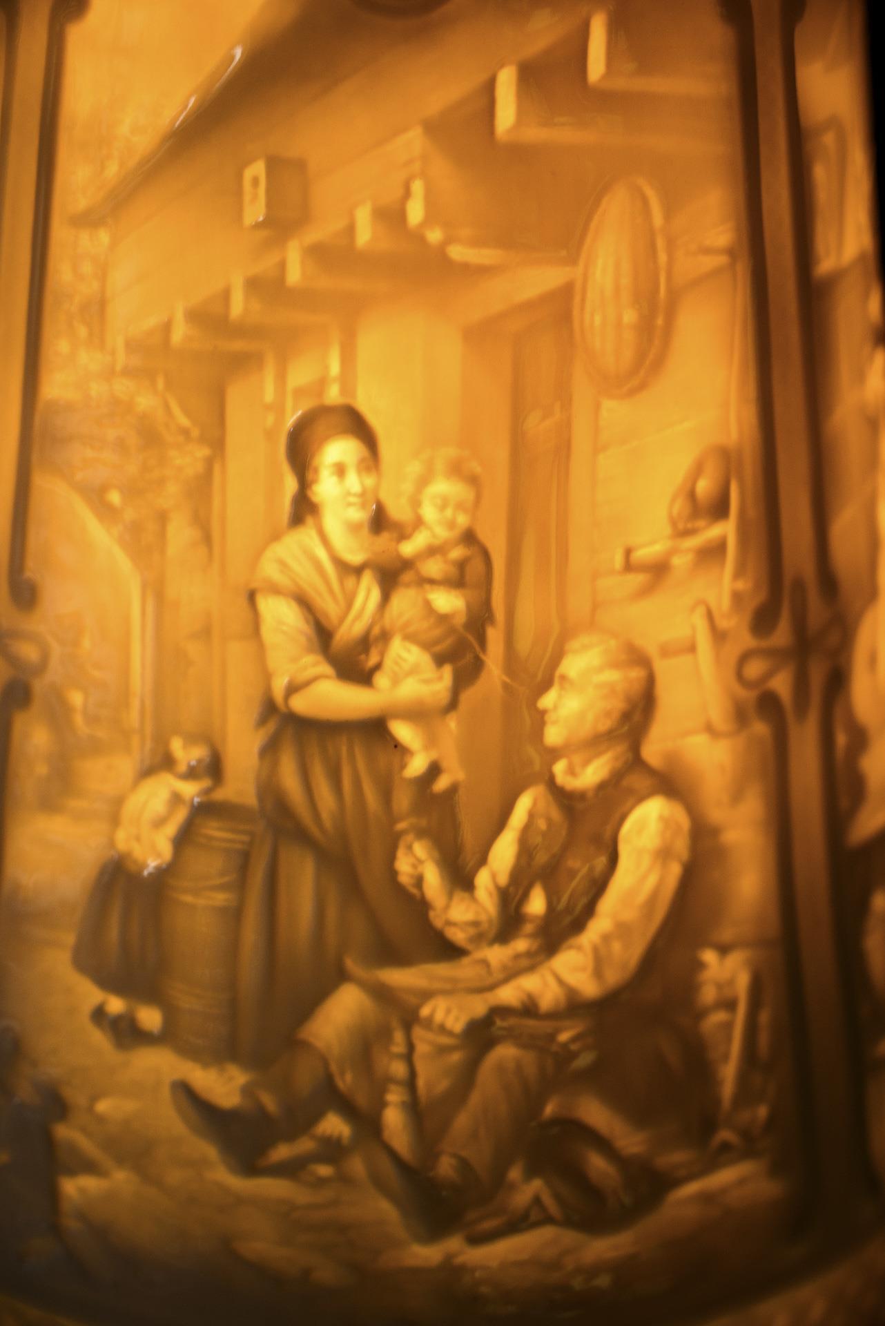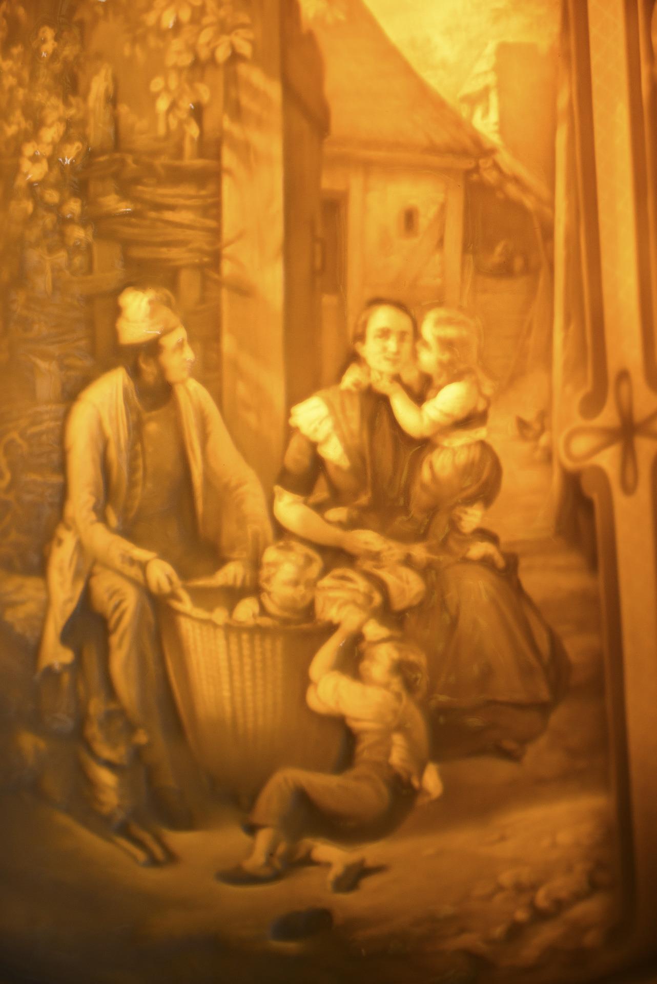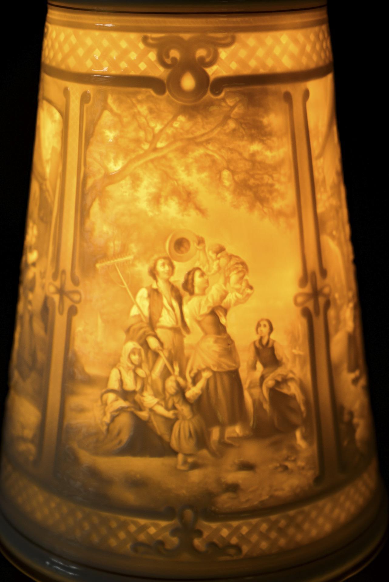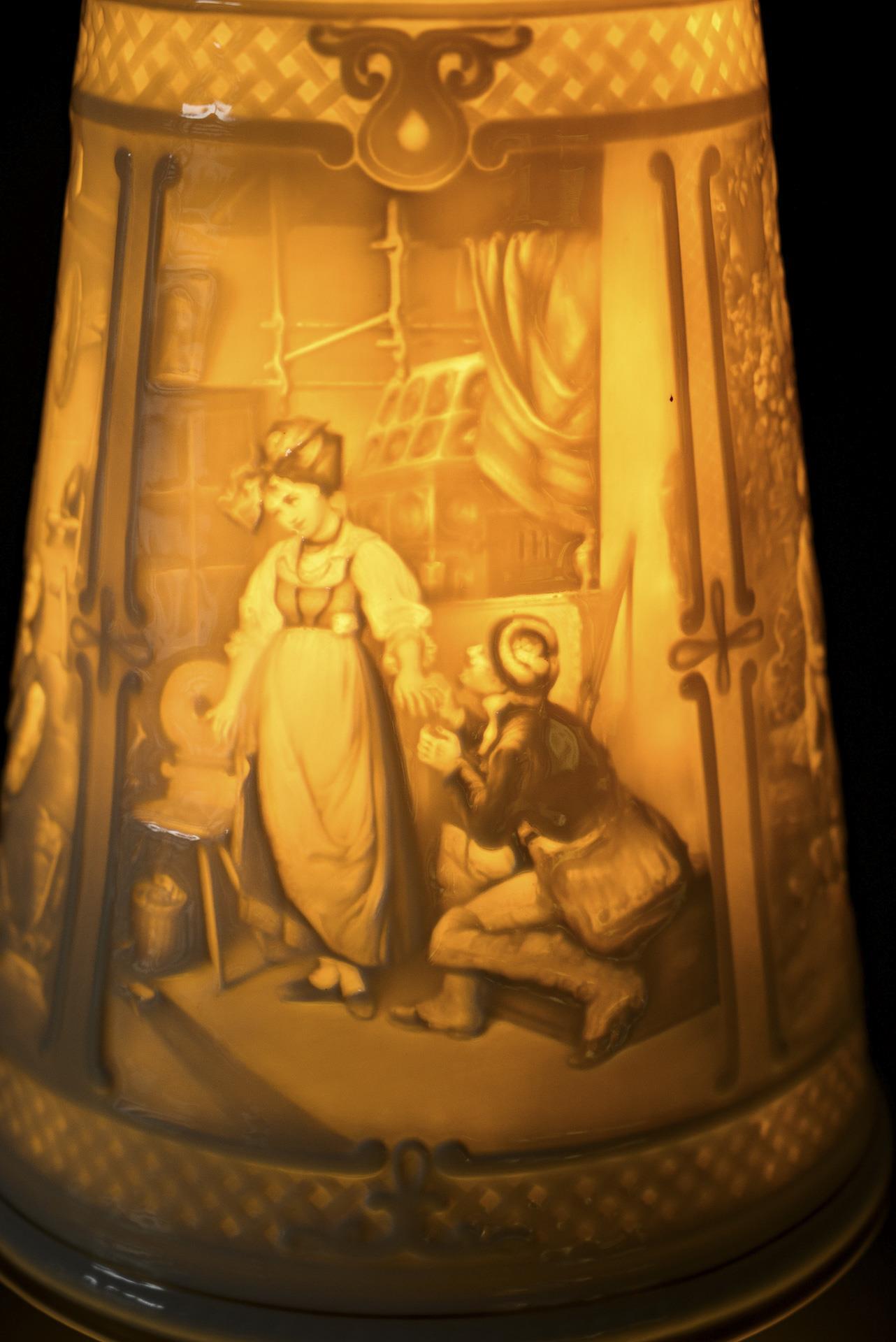 Konischer Reliefschirm mit Lithophaniebildern, auf mehrfach gegliedertem, teils durchbrochenem Schaft. Elektrifiziert.