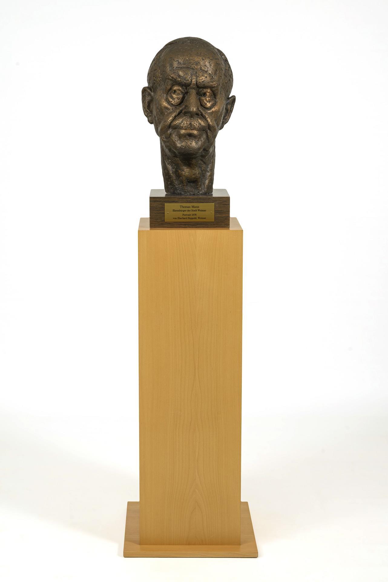 Bronze patiniert, Holzsockel, Holzstele. Deutschland. 1976. Unsigniert, Gravurplatte "Thomas Mann Ehrenbürger der Stadt Weimar Porträt 1976 von Eberhard Reppold, Weimar" an Sockel. H 62 / 171 cm. Plastik 28,4 kg.