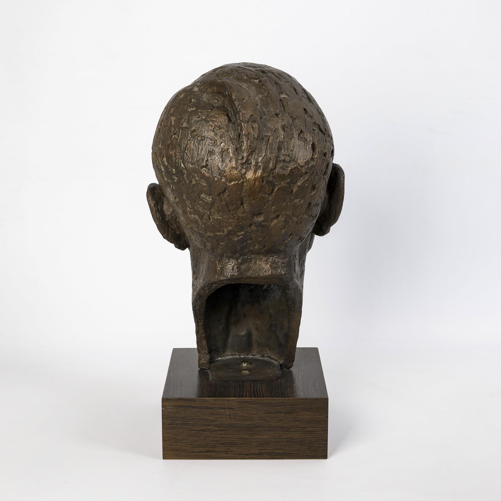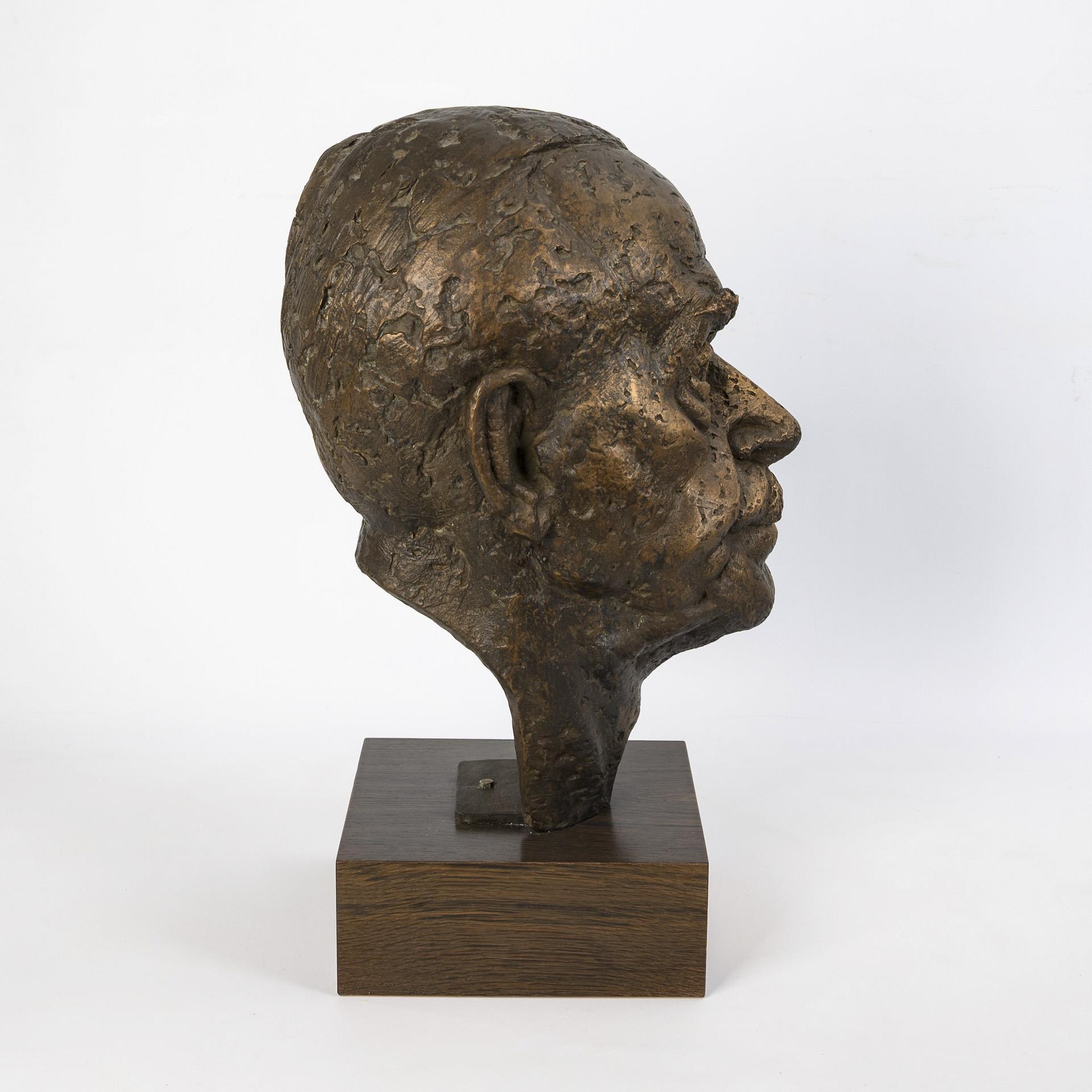 Der Schriftsteller Thomas Mann wird in dieser bronzenen Porträtbüste mit stark modellierten, markanten Gesichtszügen und sehr lebendiger Oberflächenstruktur gezeigt. Patina minimal berieben.