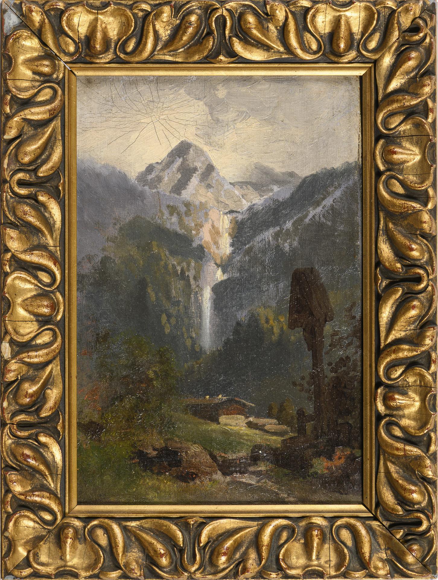 Marterl nahe einer Berghütte mit Aussicht zum großen Wasserfall unter wolkigem Himmel. Leichte Altersspuren.