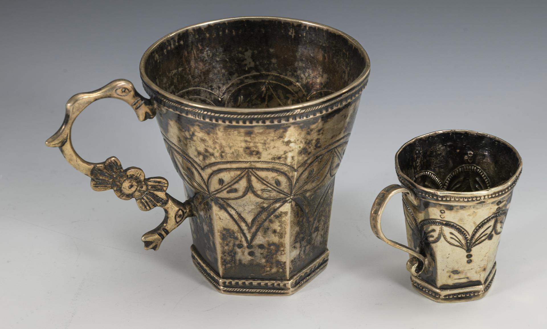Wohl persische oder russische Tässchen: die größere versilbert, H 8 cm, die kleinere Silber (geprüft), H 5 cm, 33 g. Alters- und Gebrauchsspuren.