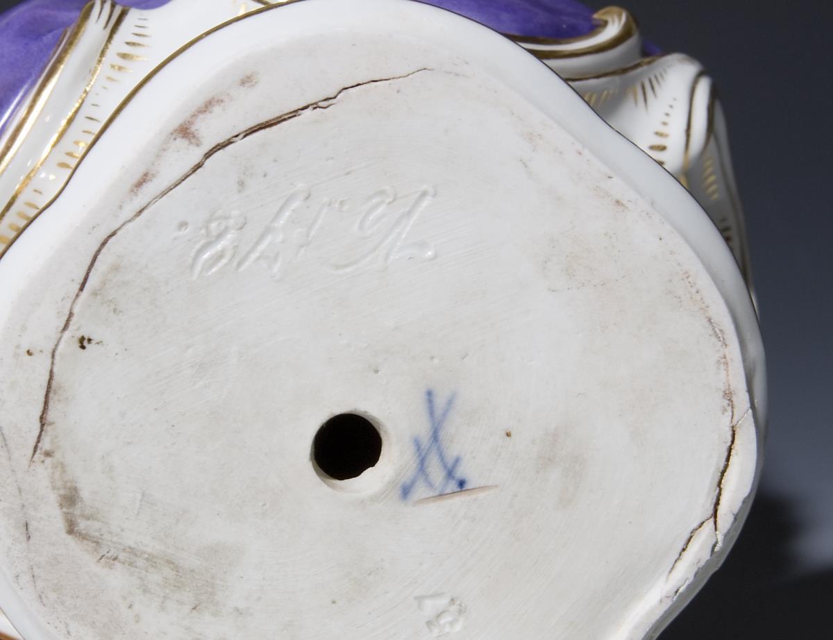 Modell von Heinrich Schwabe 1876-1877. Allegorie "Der Winter" aus einer Serie "Die vier Jahreszeiten". Farbig bemalt, gold staffiert. Unglasierter Boden, Ritzmarke, Schwertermarke einmal gestrichen. Sockelrand rückseitig sichtbar alt restauriert.