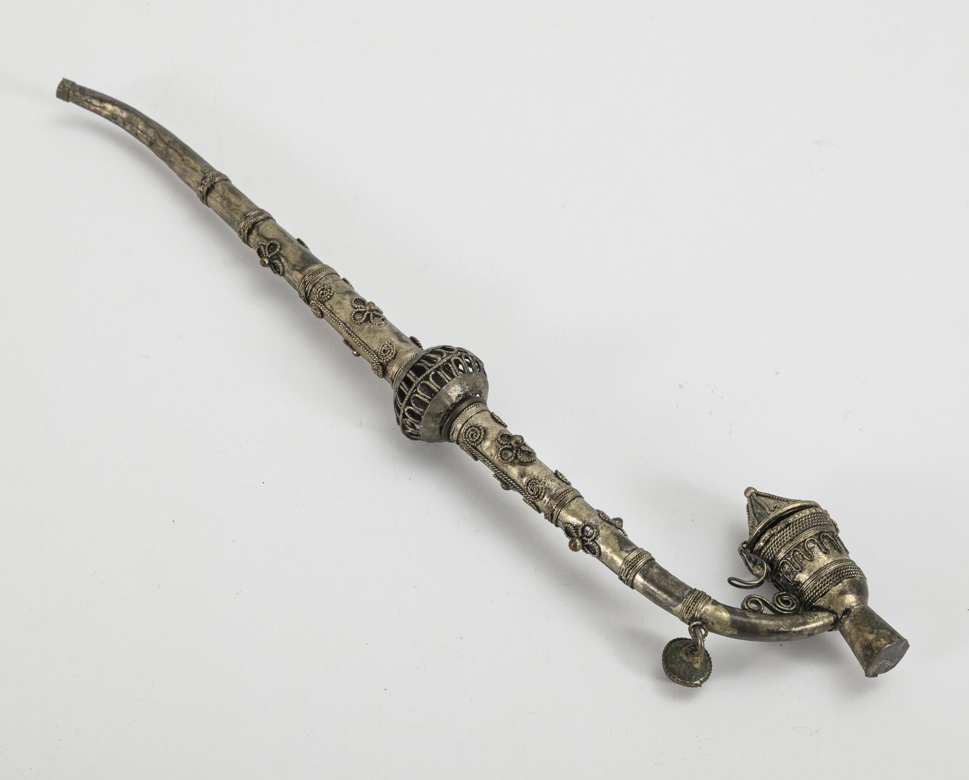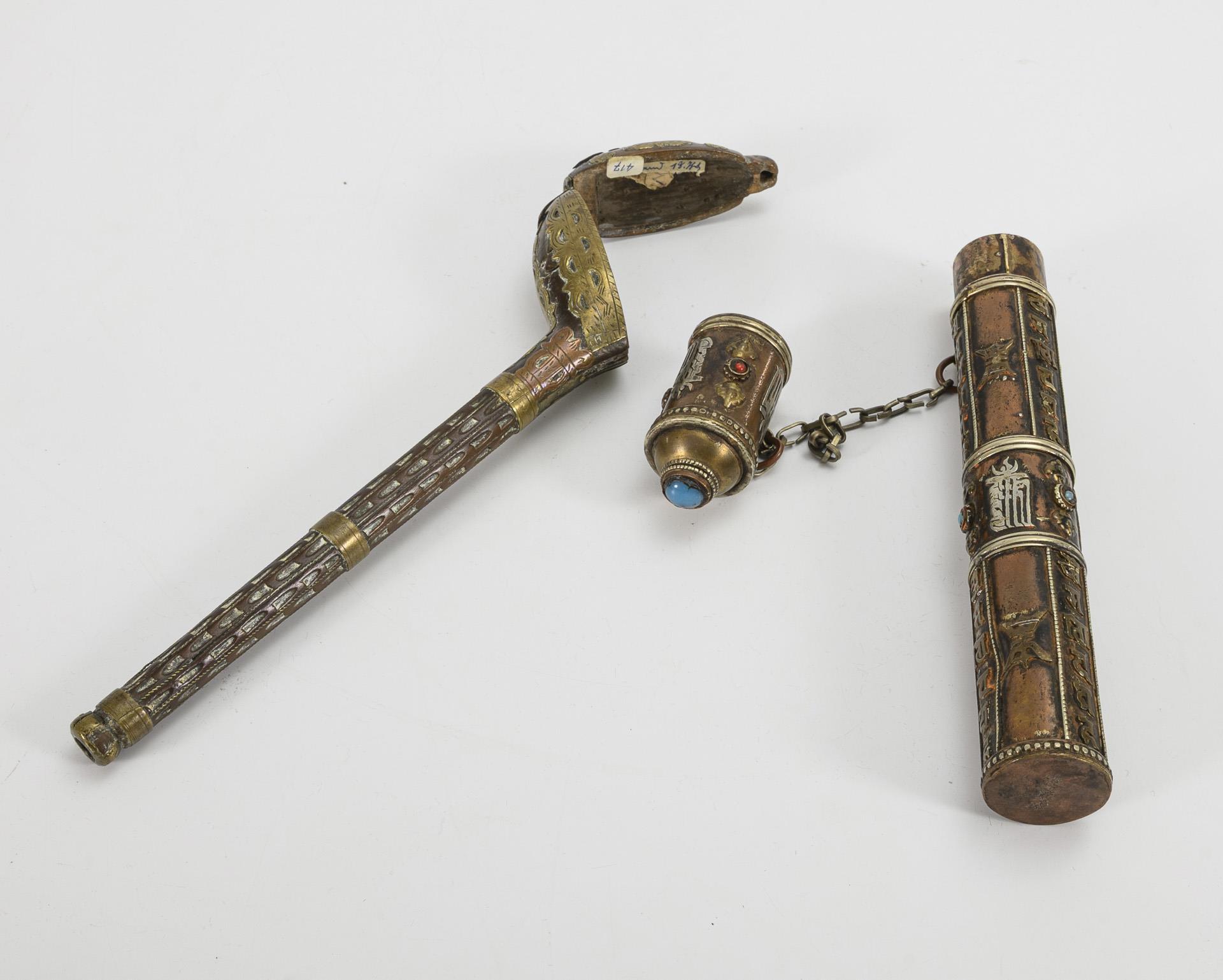 Silbergürtel mit Schraubverschluss L 80 cm, Umfang 76 cm. / 2 Feuersteintaschen / 1 zylindrische Kupfer-Hülse mit Schriftapplikationen aus unterschiedlichen Metallen und Steinbesatz, L 23 cm / Hölzerne Schutzhülle für eine Pfeife mit reliefiertem Metallbeschlag, L 23 cm. / Zierliche Metallpfeife mit Zierdraht und durchbrochen gearbeitetem Nodus, L 31 cm, in passendem Kasten. Alters- und Gebrauchsspuren.