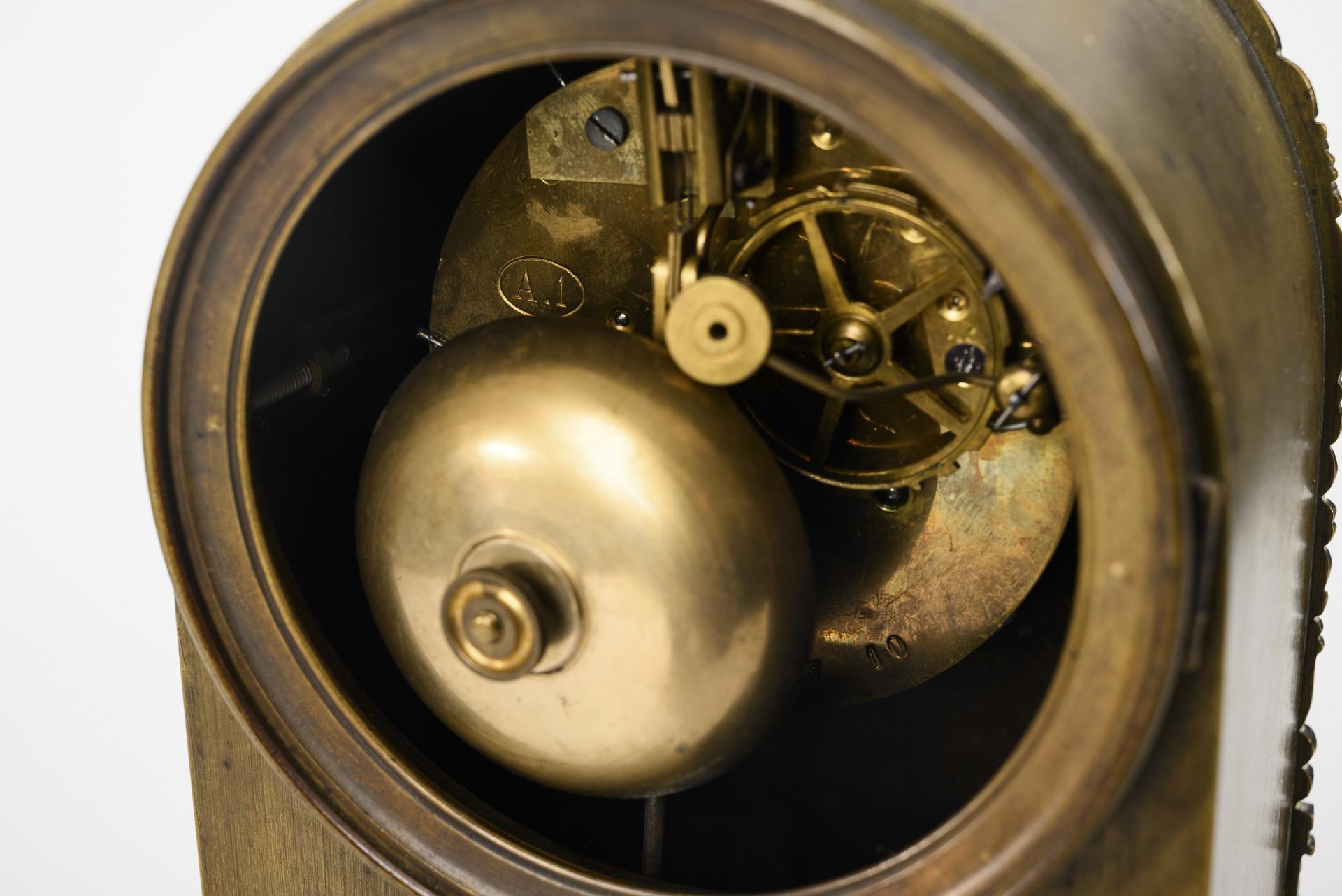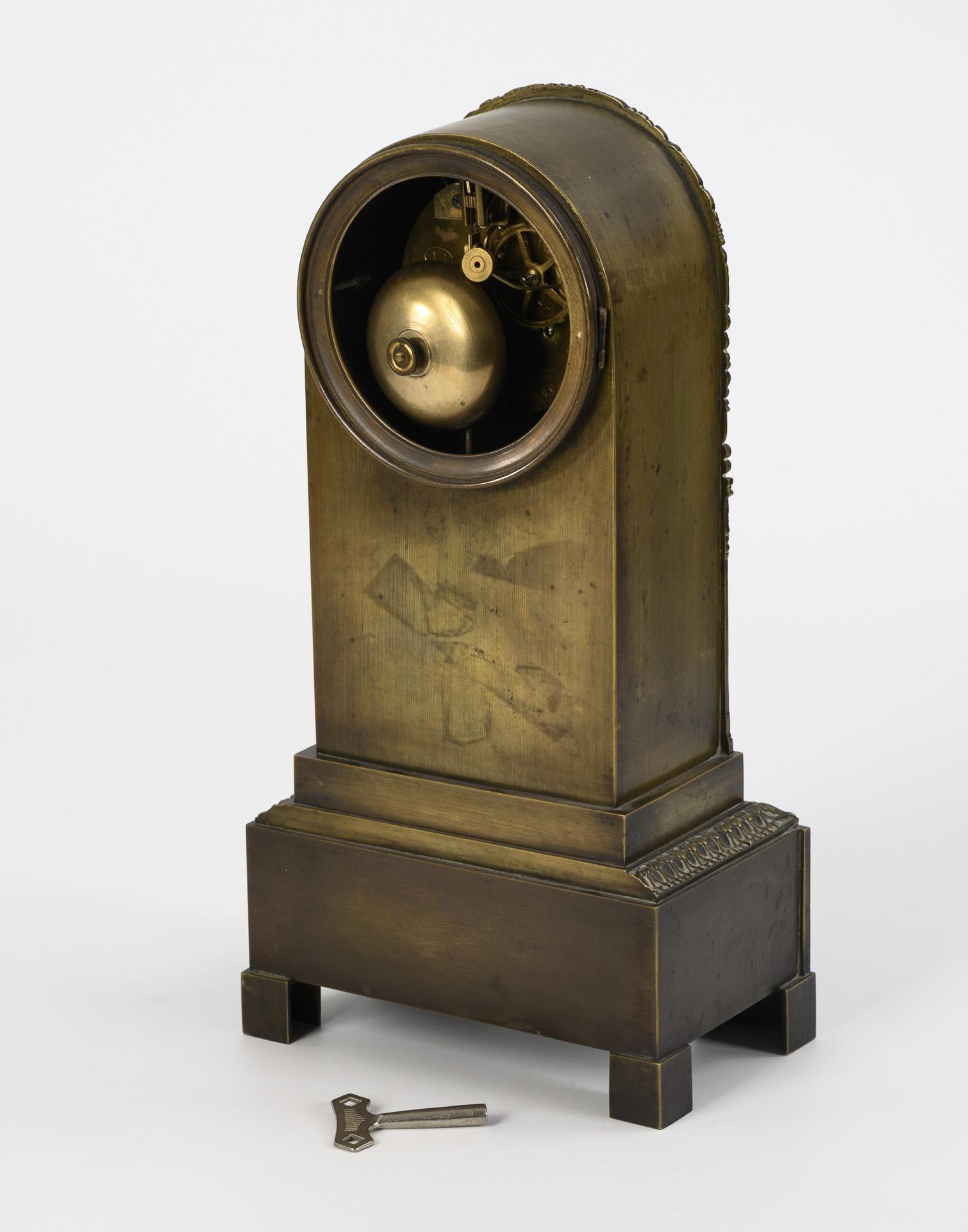 Rundbogenförmiges Tombeau-Gehäuse mit vorkragendem Sockel sowie floral reliefierter Front mit antikisierendem Figurenfries und Putten. Ziffernblatt mit Defekten.