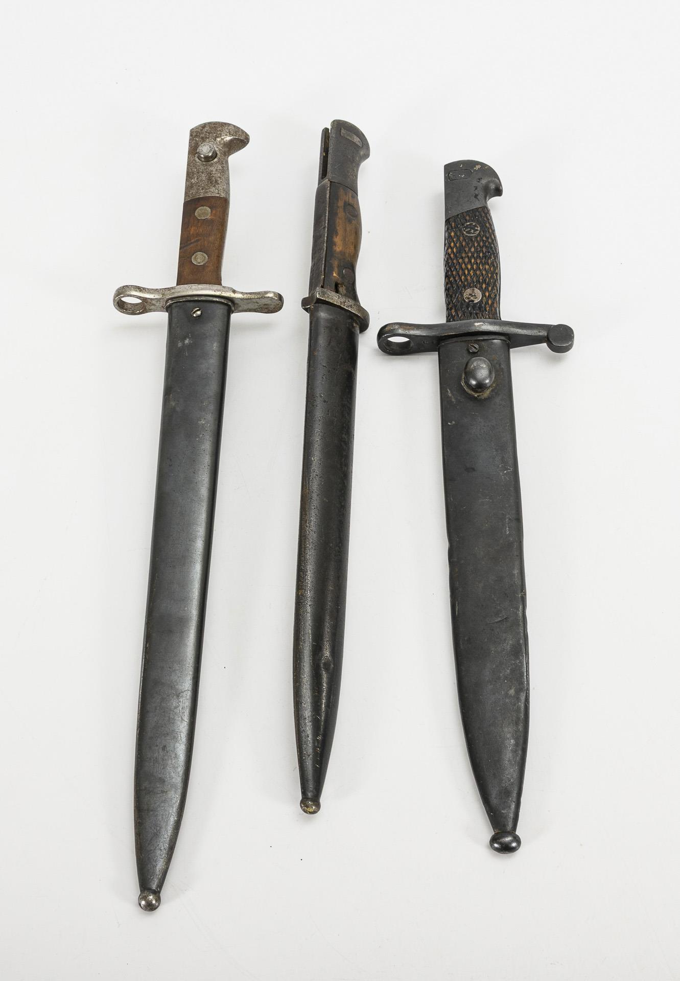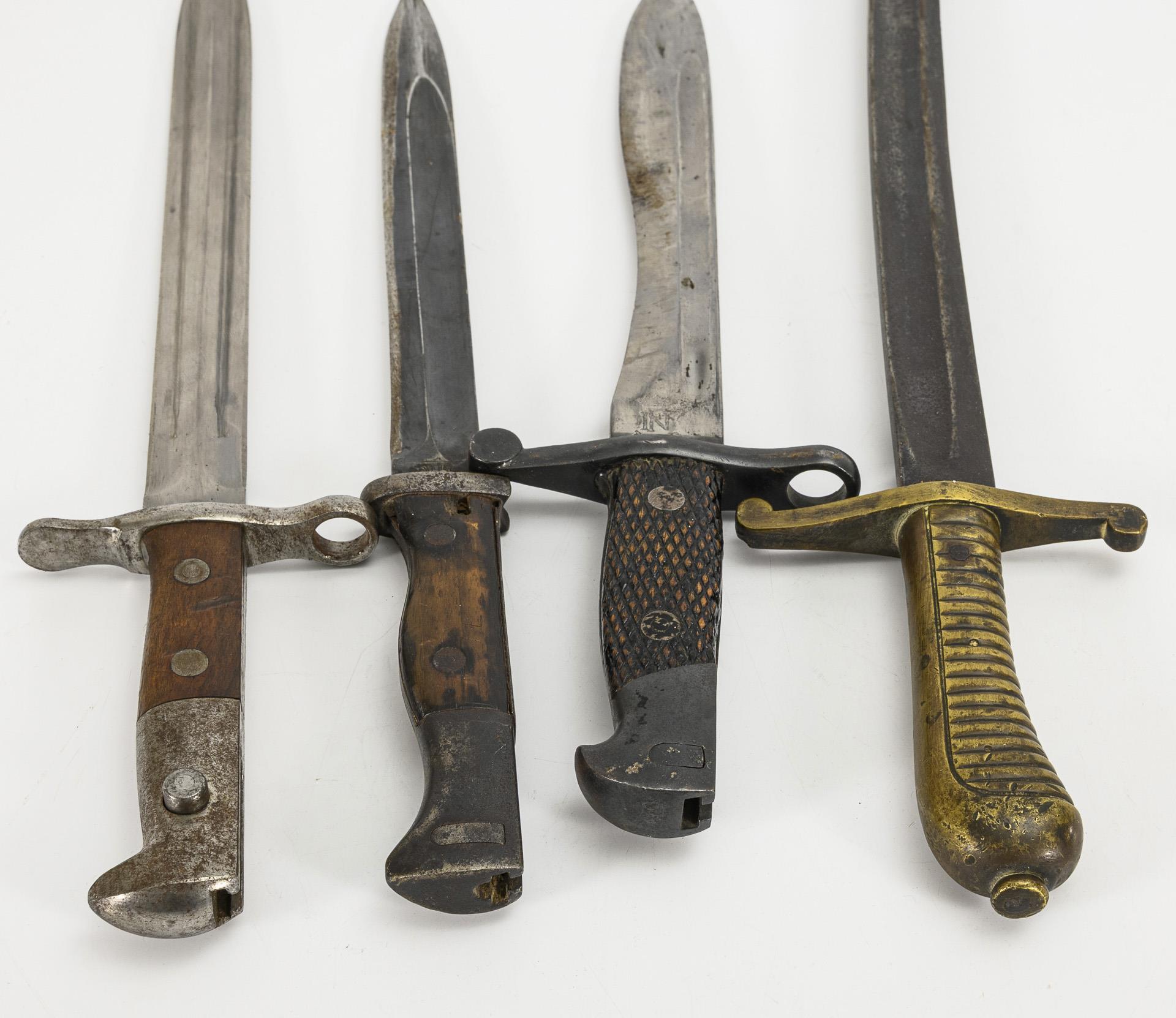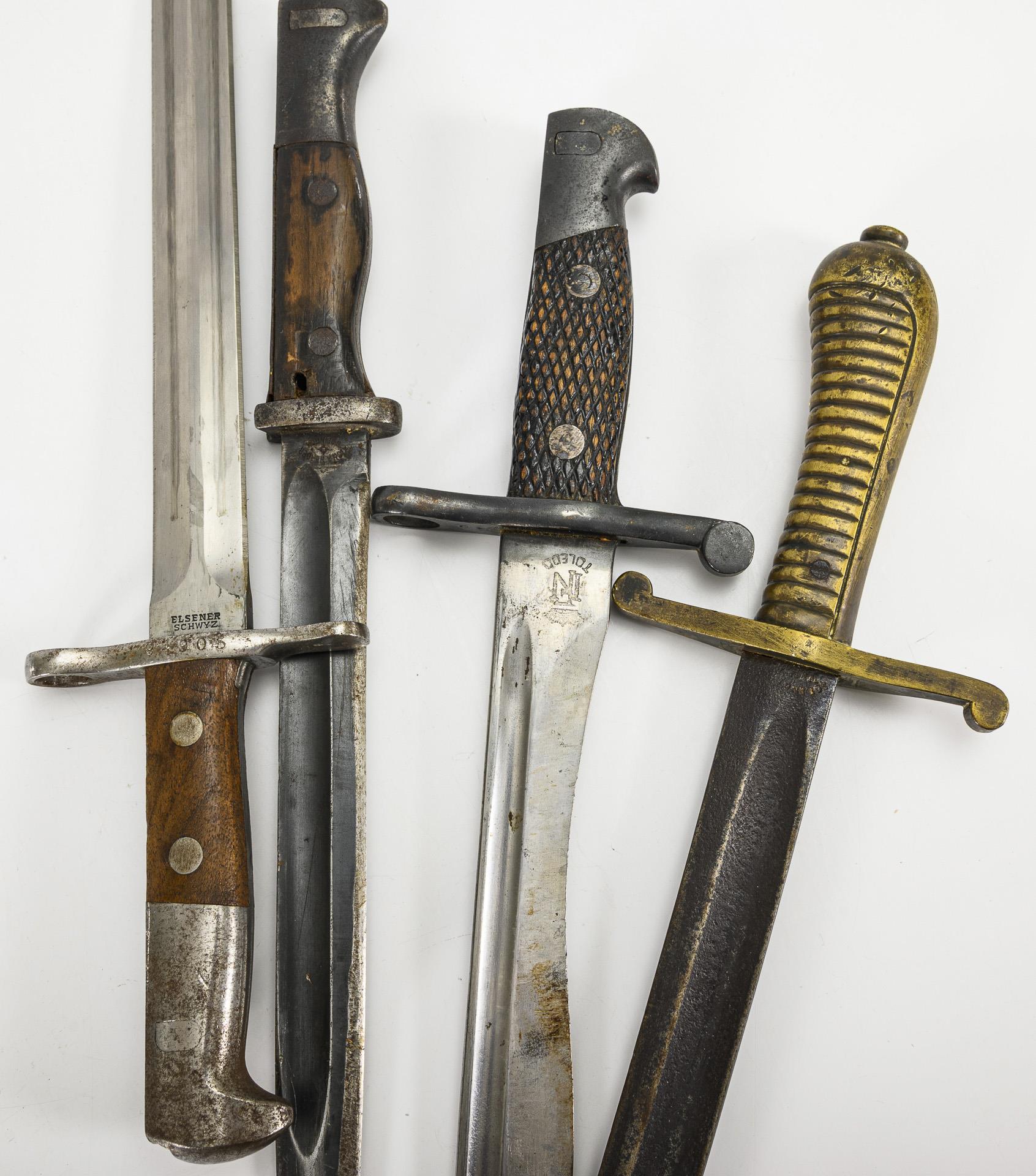 Seitenwaffe oder Faschinenmesser mit Yataganklinge, gemarkt "Solingen". Gerippter Messinggriff mit gerader Parierstange. L 59 cm. / Schweizer Bajonett. Gerade, zweischneidige Klinge mit Spitze in der Mittellinie. Gemarkt: "Elsener Schwyz". Gerade Parierstange mit Mündungsloch. Holzgriff mit Arretierung. Metallscheide mit Lederschlaufe. Gesamt L 45 cm. / Deutsches Bajonett mit gerader, einschneidiger Klinge, Spitze in der Mittelinie und breitem Hohlschliff. Gemarkt "Richa. Herber Solingen". Holzgriff mit Arretierung, Metallscheide. Stärkere Gebrauchsspuren. Gesamt L 41 cm. / Spanisches Bajonett mit Boloklinge. Gemarkt "F N Toledo". Holzgriff mit Arretierung. Metallscheide. Gesamt L 39,5 cm.