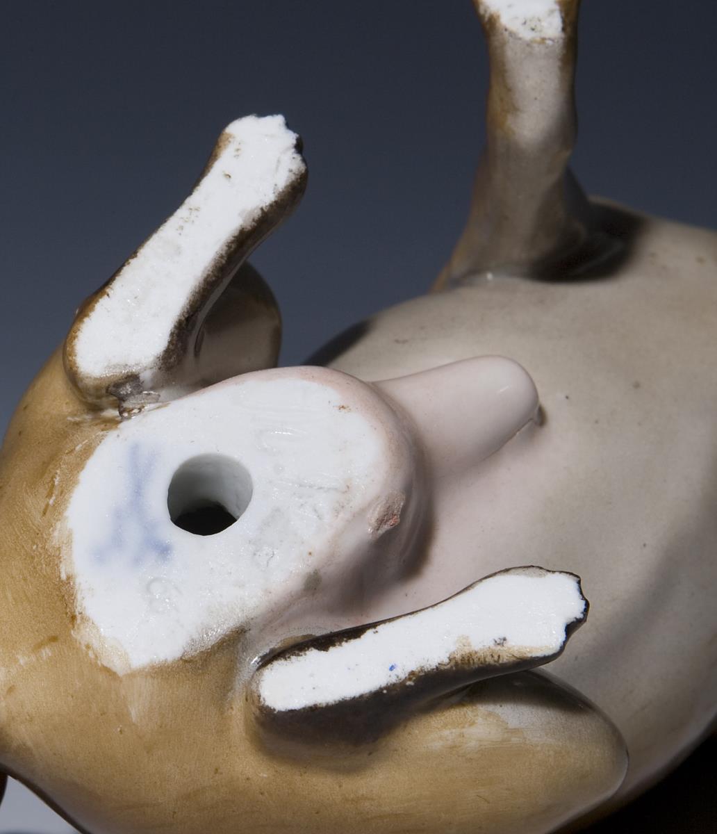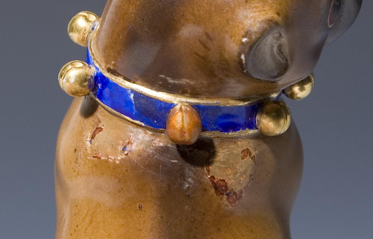 Modell von Franz Andreas Weger 1806. Naturalistisch bemalt, gold staffiert. Unglasierter Boden, Pressmarke, Ritzmarke, Schwertermarke 1. Wahl . Rückseitig am Halsband sichtbar alt restauriert.