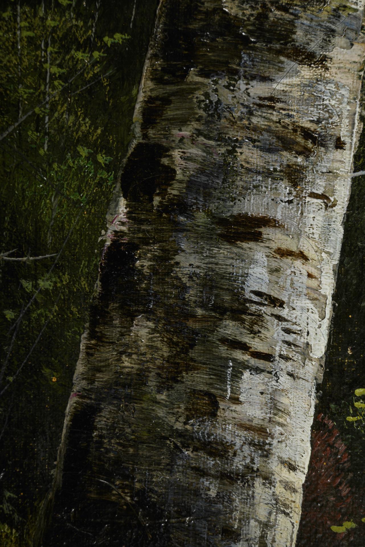 Langer Weiher mit Kahn zwischen dicken Birken unter wolkigem Himmel.