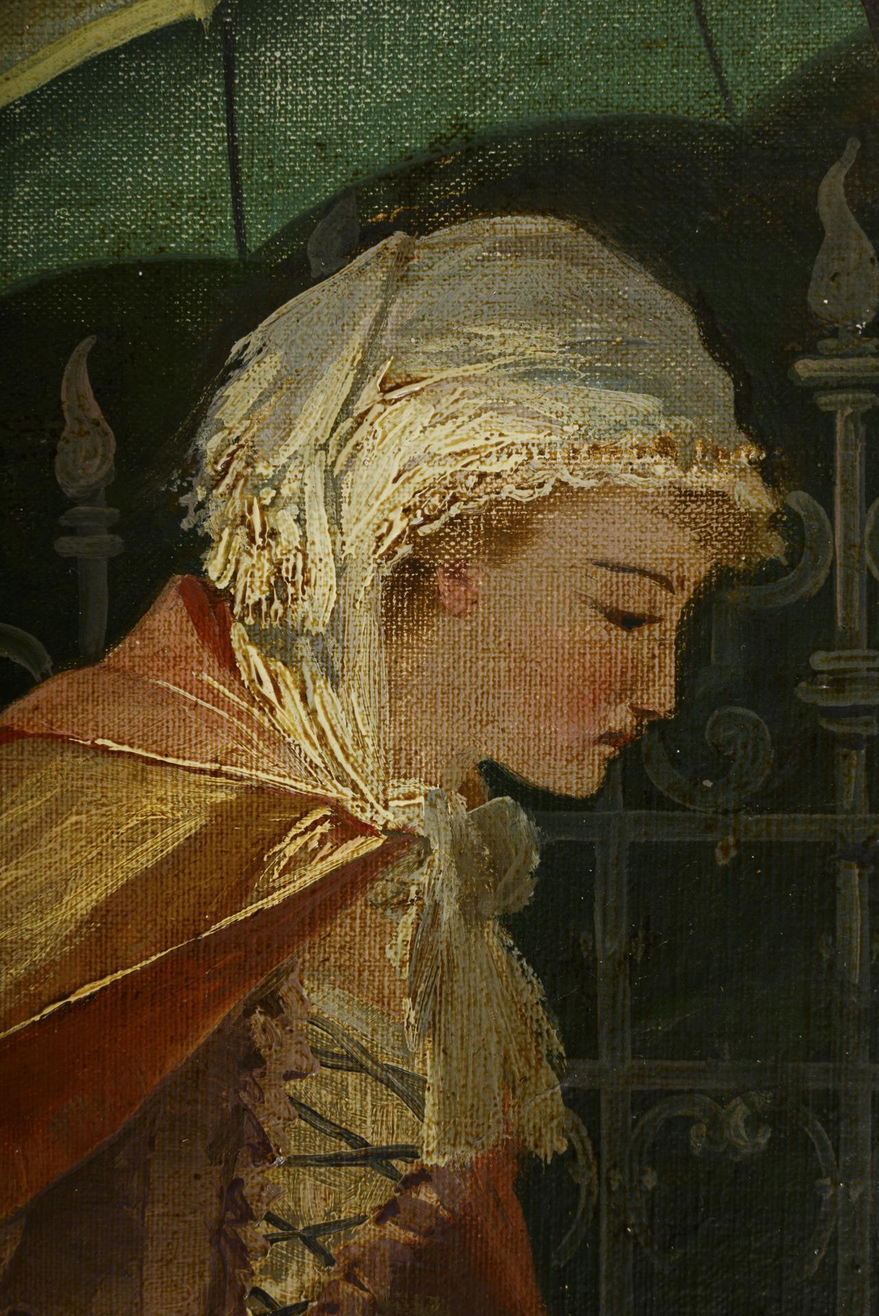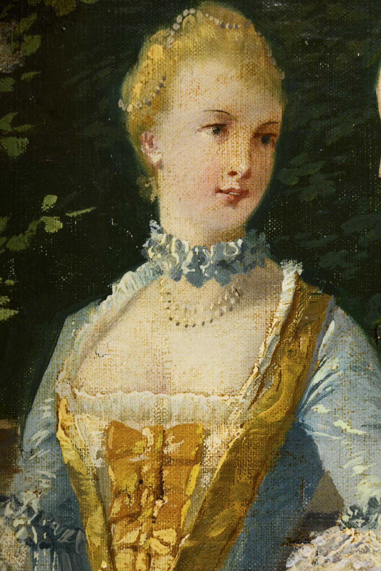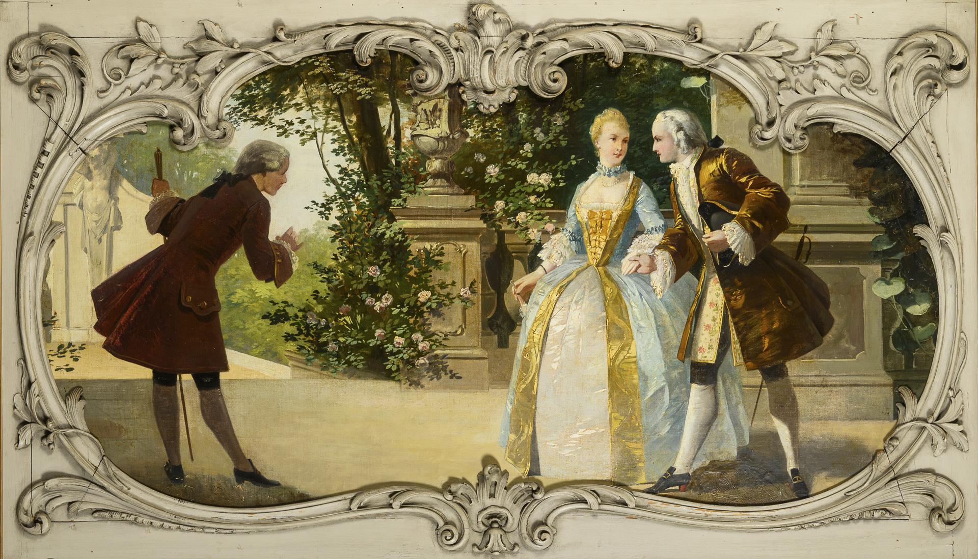 Je galante Szenen mit Personen in der Kleidung des 18. Jahrhunderts bei herrschaftlicher Architektur. Altersspuren.
