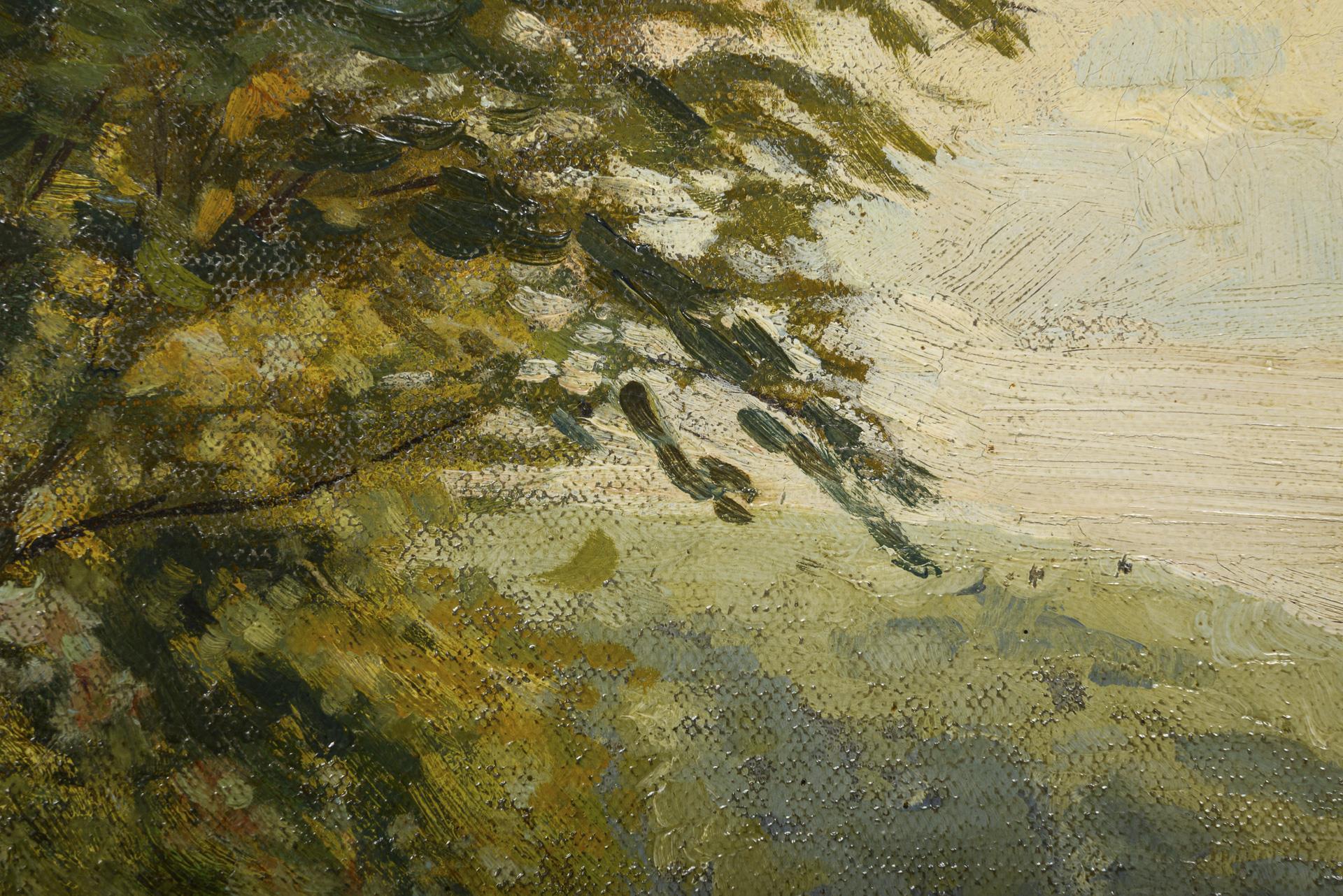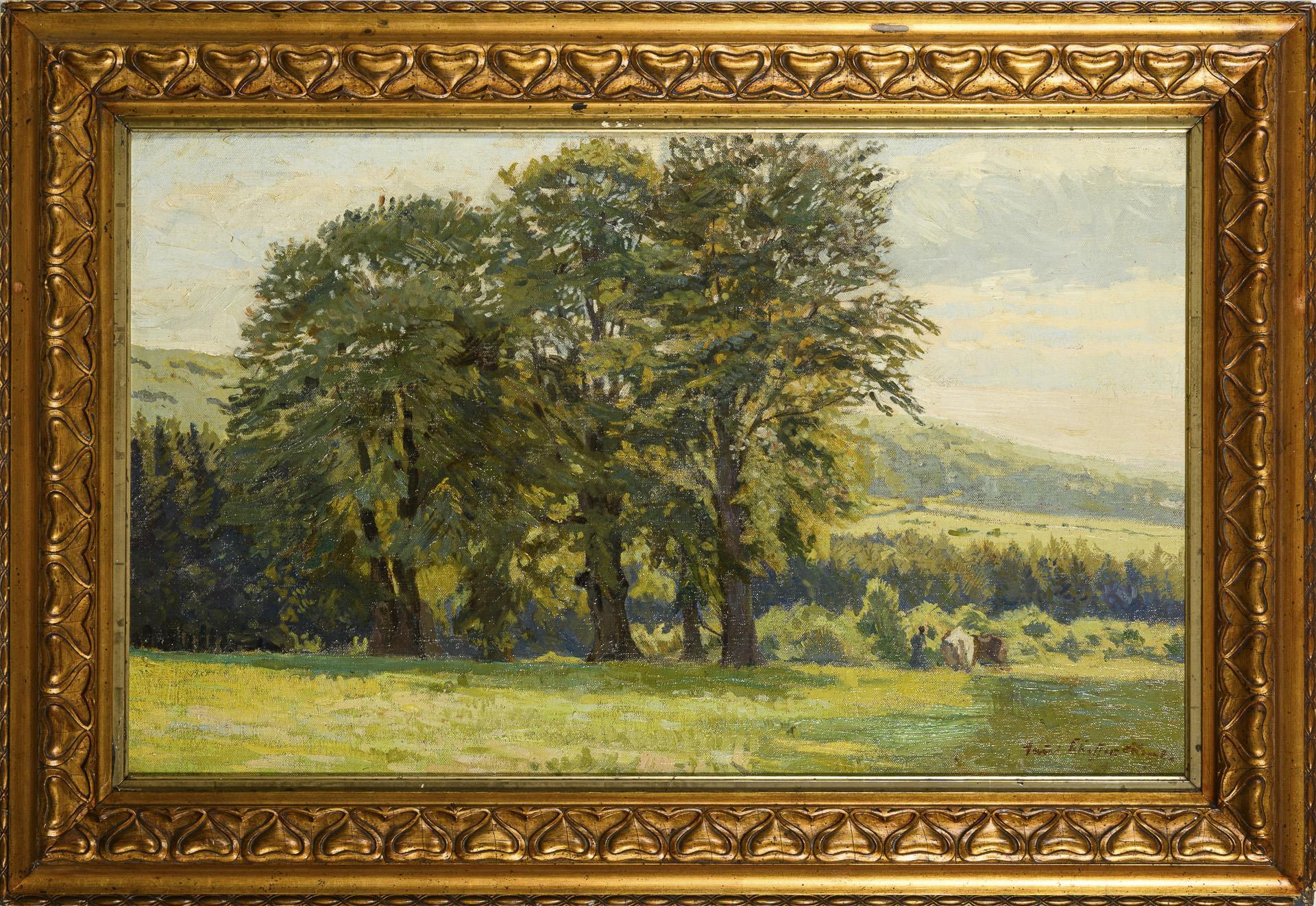 Staffagefiguren nahe einer Baumgruppe auf grüner Wiese in weiter hügeliger Landschaft.