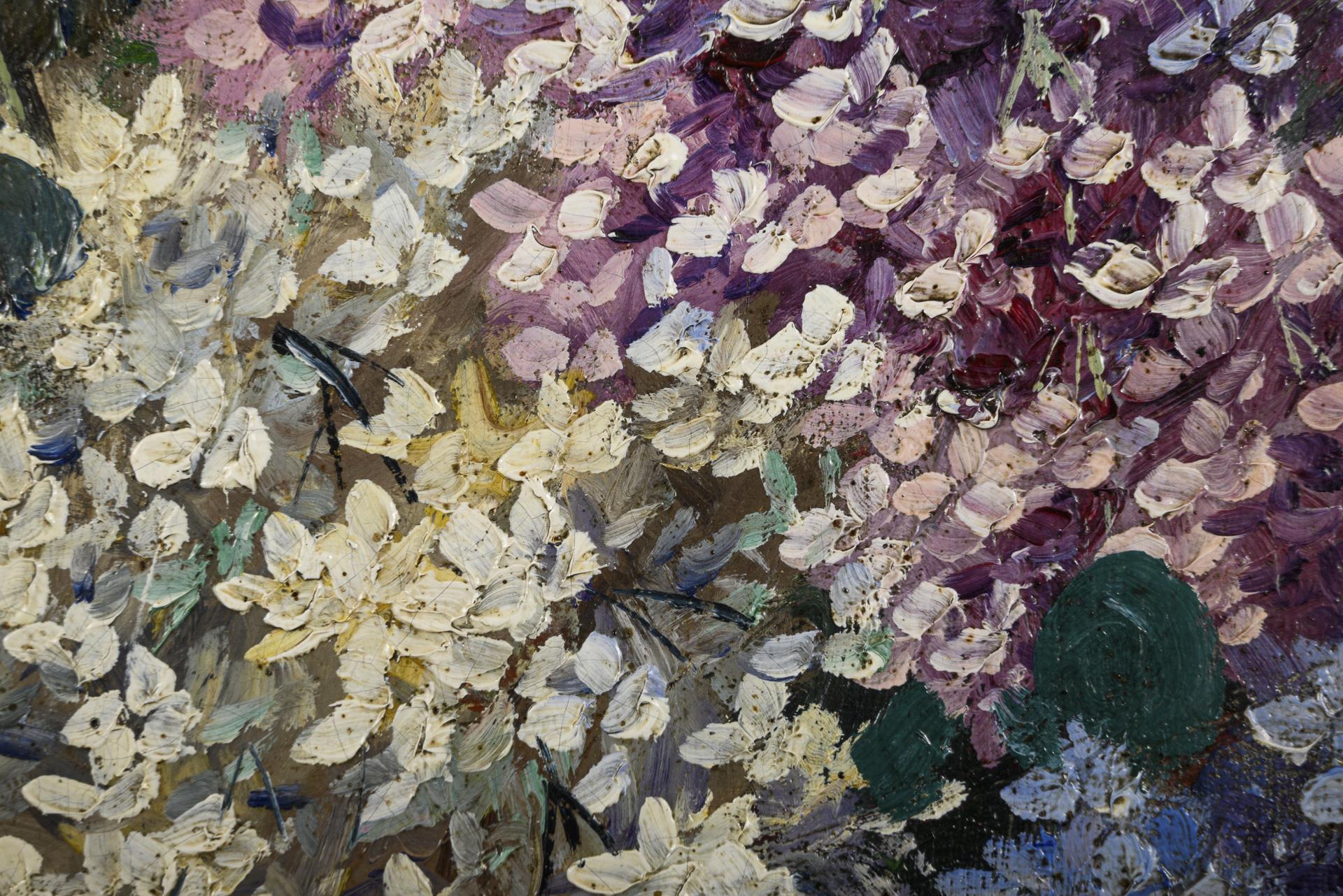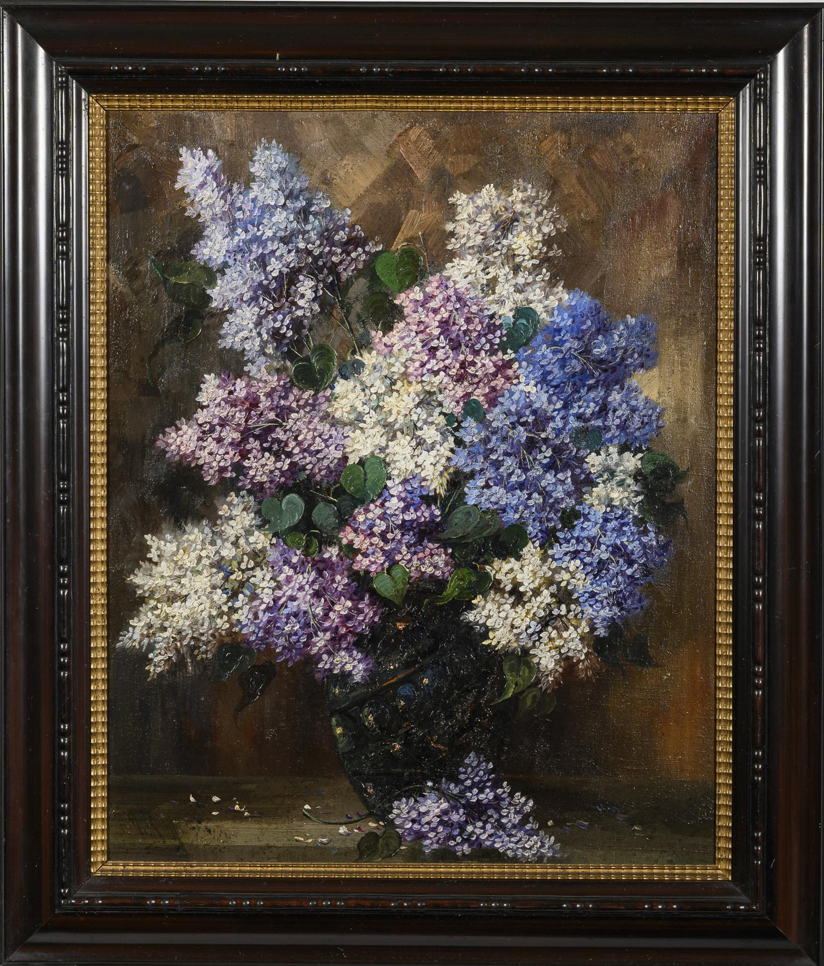 Großer Strauß aus verschiedenfarbigem Flieder in dunkler Vase.