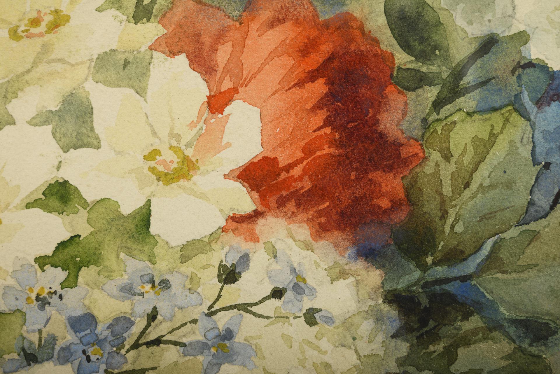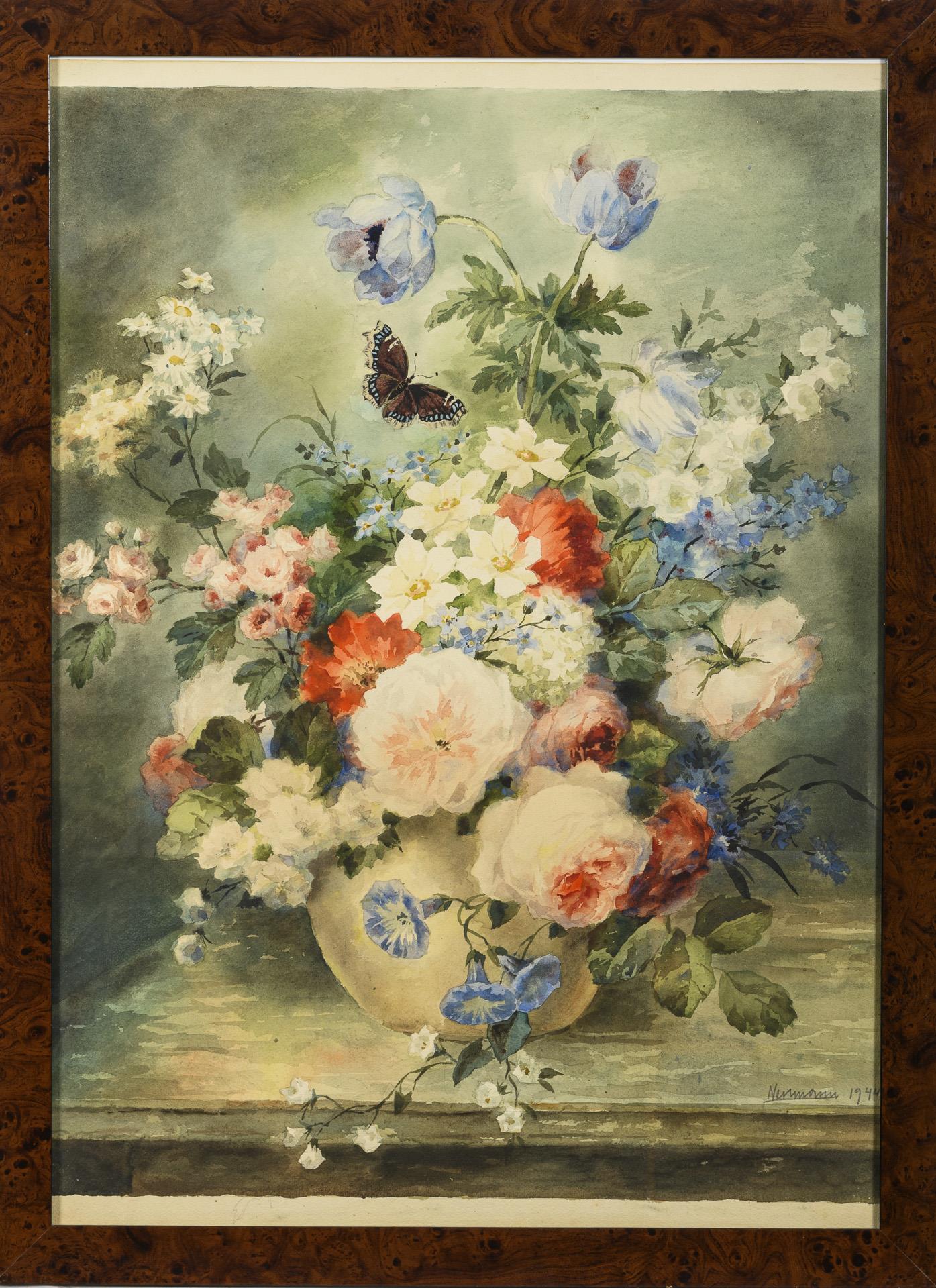 Großer Blumenstrauß mit heranfliegendem Schmetterling in heller Vase.
