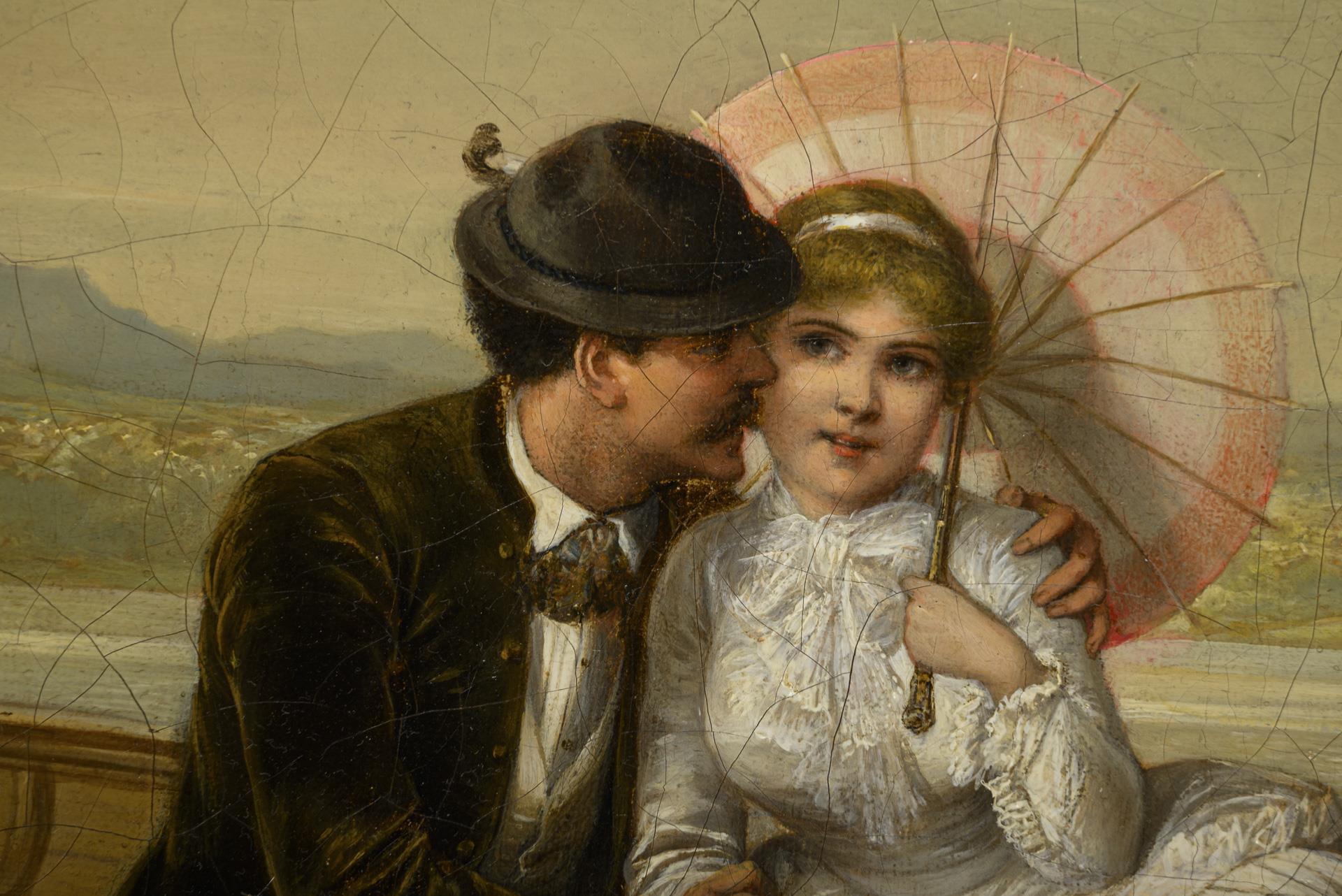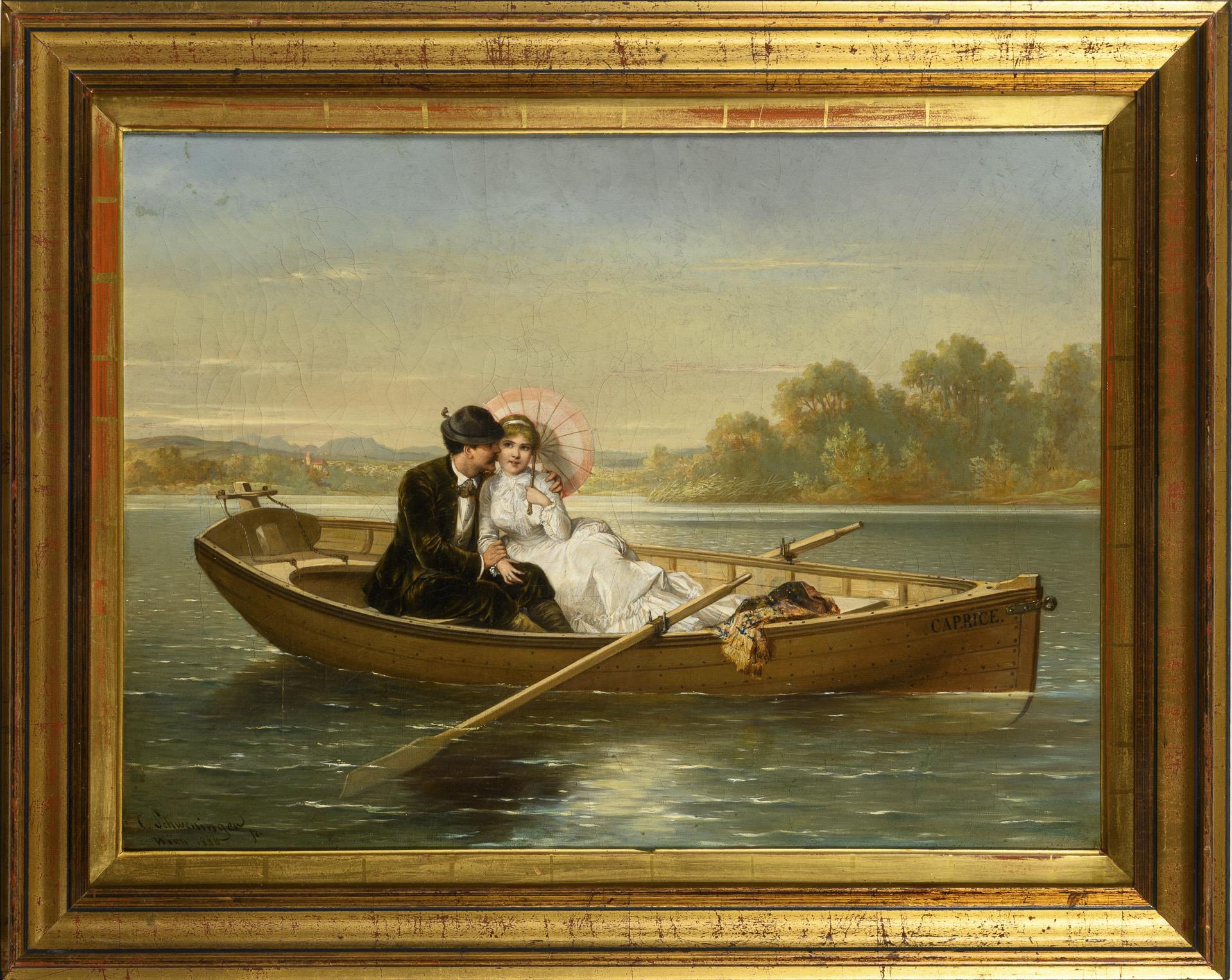 Liebespaar im Kahn in vertraut inniger Zweisamkeit. Das Bild ist erwähnt im Boetticher "Malerwerke des 19. Jahrhunderts", Band II,2 Seite 697, Nr. 28. Altersspuren.
