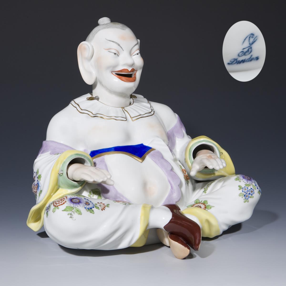 Nach einem Meissen-Modell um 1740. "Pagode, männlich". Zunge, Kopf und Hände sind beweglich eingehangen. Kopf mit Gegengewicht. Farbig bemalt, gold stafiert. Pressmarke, Blaumarke innen. Runder Kopfausschnitt für das Gegengewicht restauriert.