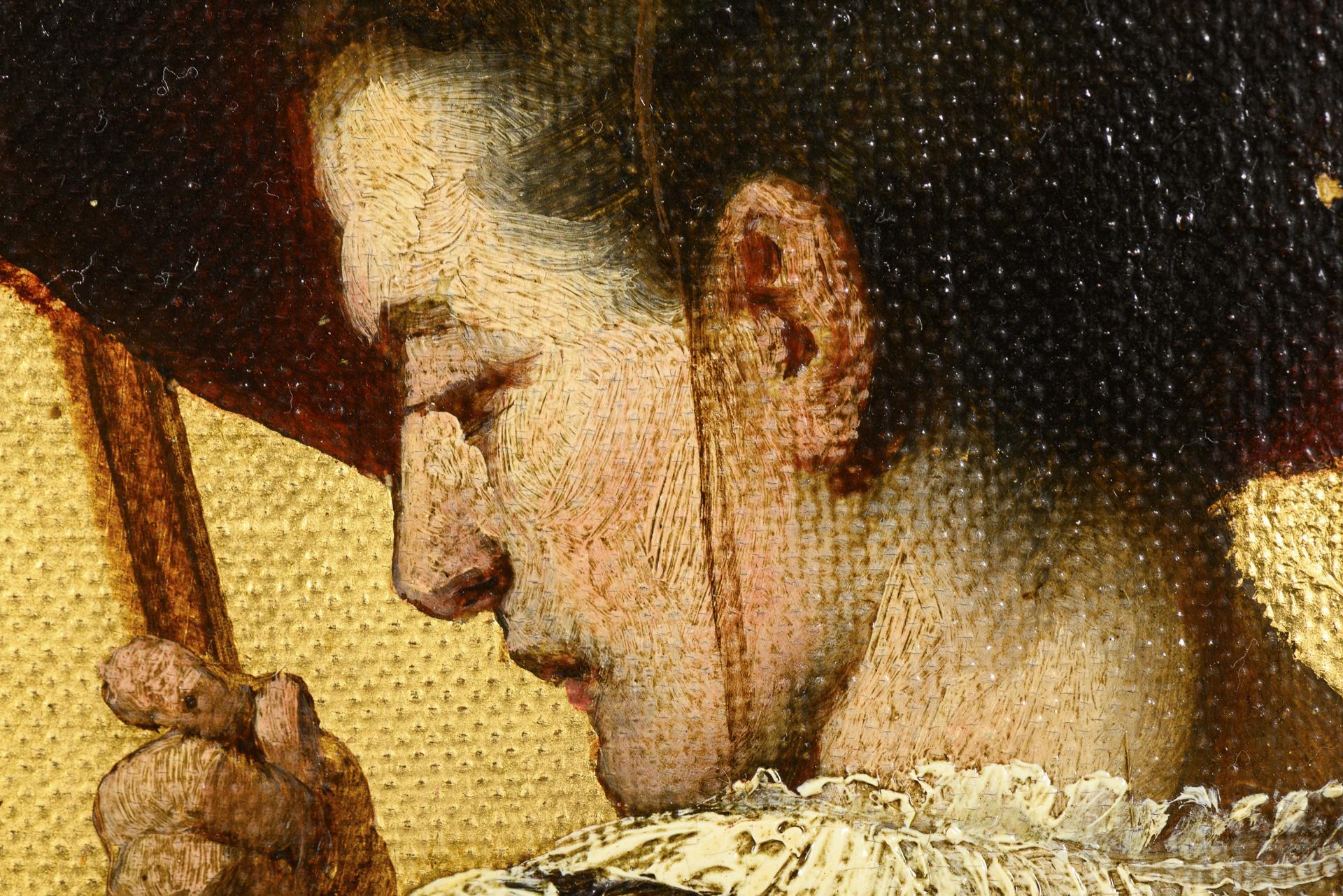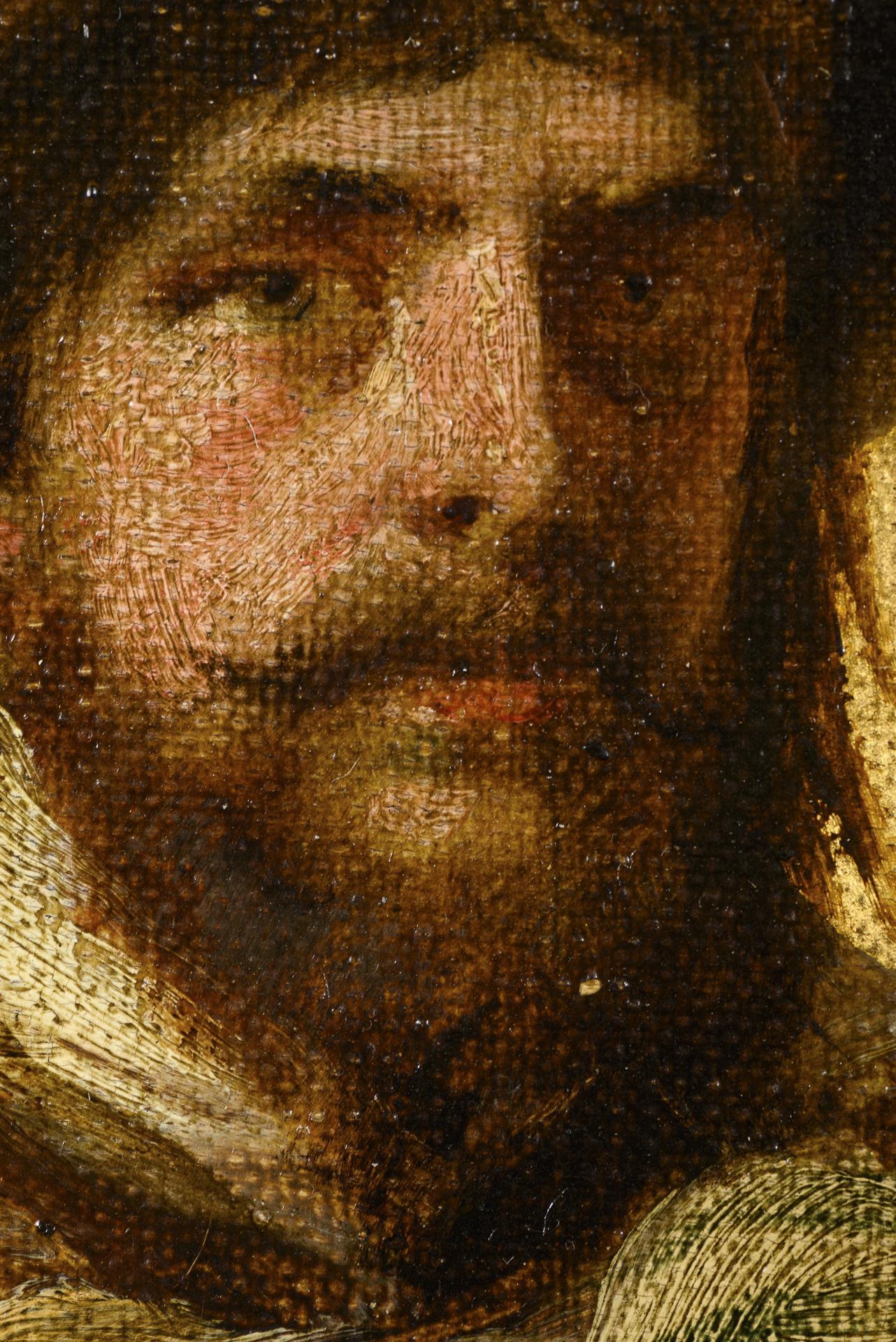 Darstellung der beiden Männer in einer Landschaft vor goldenem Hintergrund wie auf den Flügeln eines Triptychons.