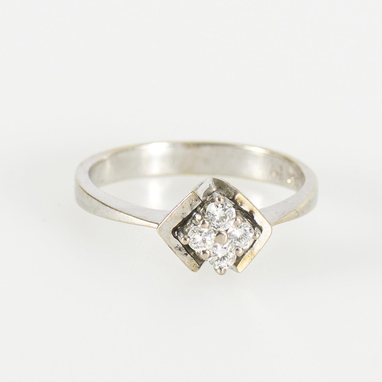 Ring mit 4 chatongefassten Brillanten in einem geometrisch gestalteten Ringkopf.