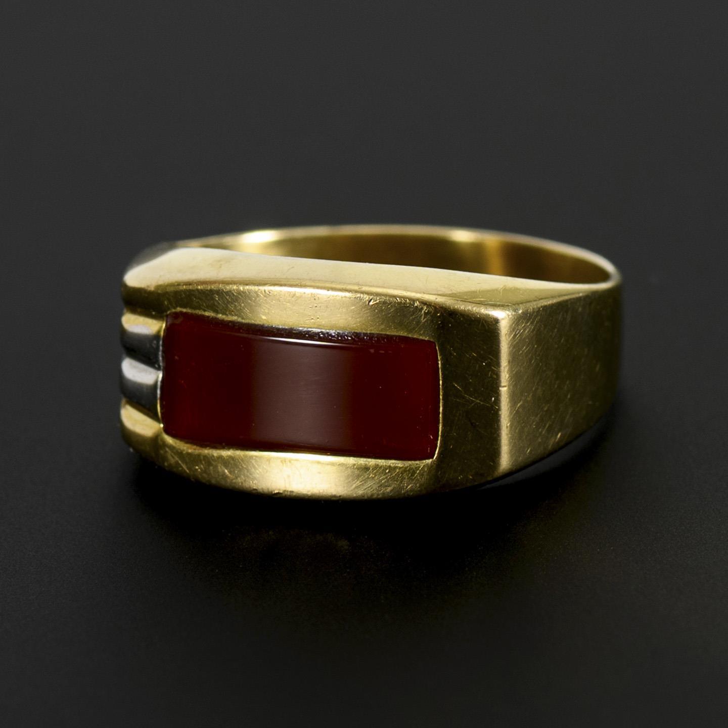 Breiter Ring mit Karneoleinlage, eine der Ringschultern zweifarbig gestaltet. Tragespuren.
