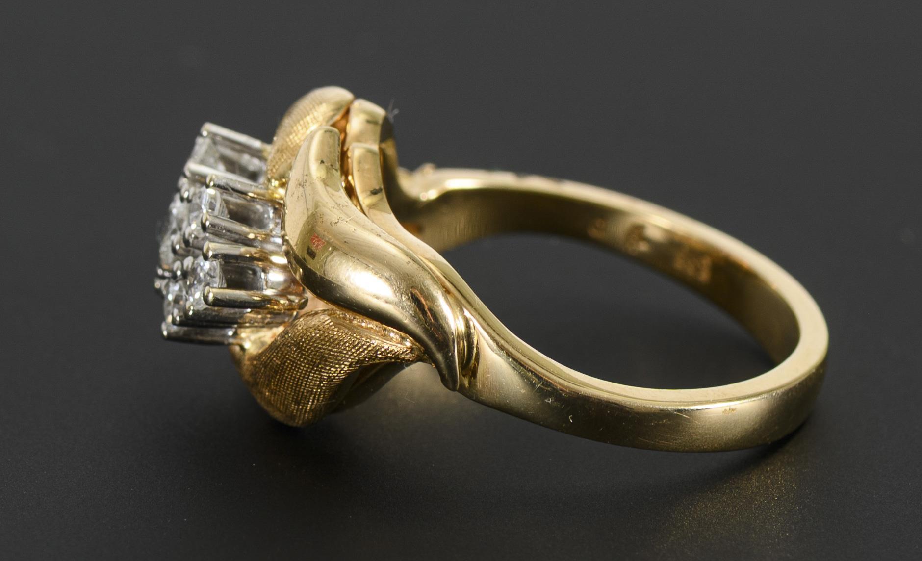 Gelb- und Weißgold 585 gestempelt. Ringgröße 57, Breite max. 11,50 mm, Durchmesser des zentralen, größten Brillanten (in der Fassung gemessen) 2,74 mm. 7,0 g.