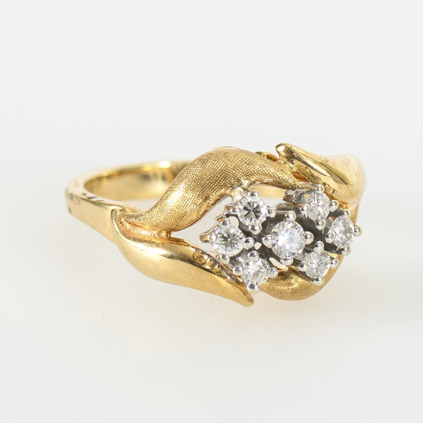 Ring mit 7 in Weißgold krappengefassten Brillanten, erhaben in Form zweier sich überlappender Rhomben in einem geschweiften Ringkopf gefasst.