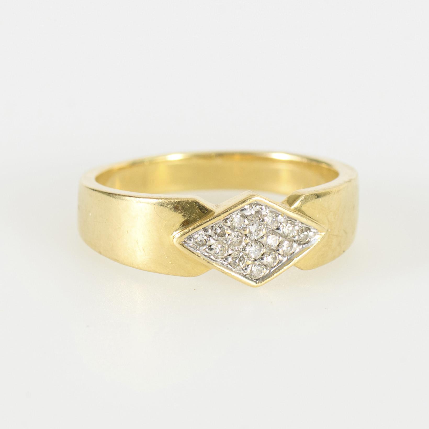 Breiter Ring mit rhombenförmig angeordnetem Cluster aus pavégefassten, kleinen Brillanten. An der Ringschiene mit leichten Tragespuren, innen Verkleinerung der Ringschiene erkennbar.