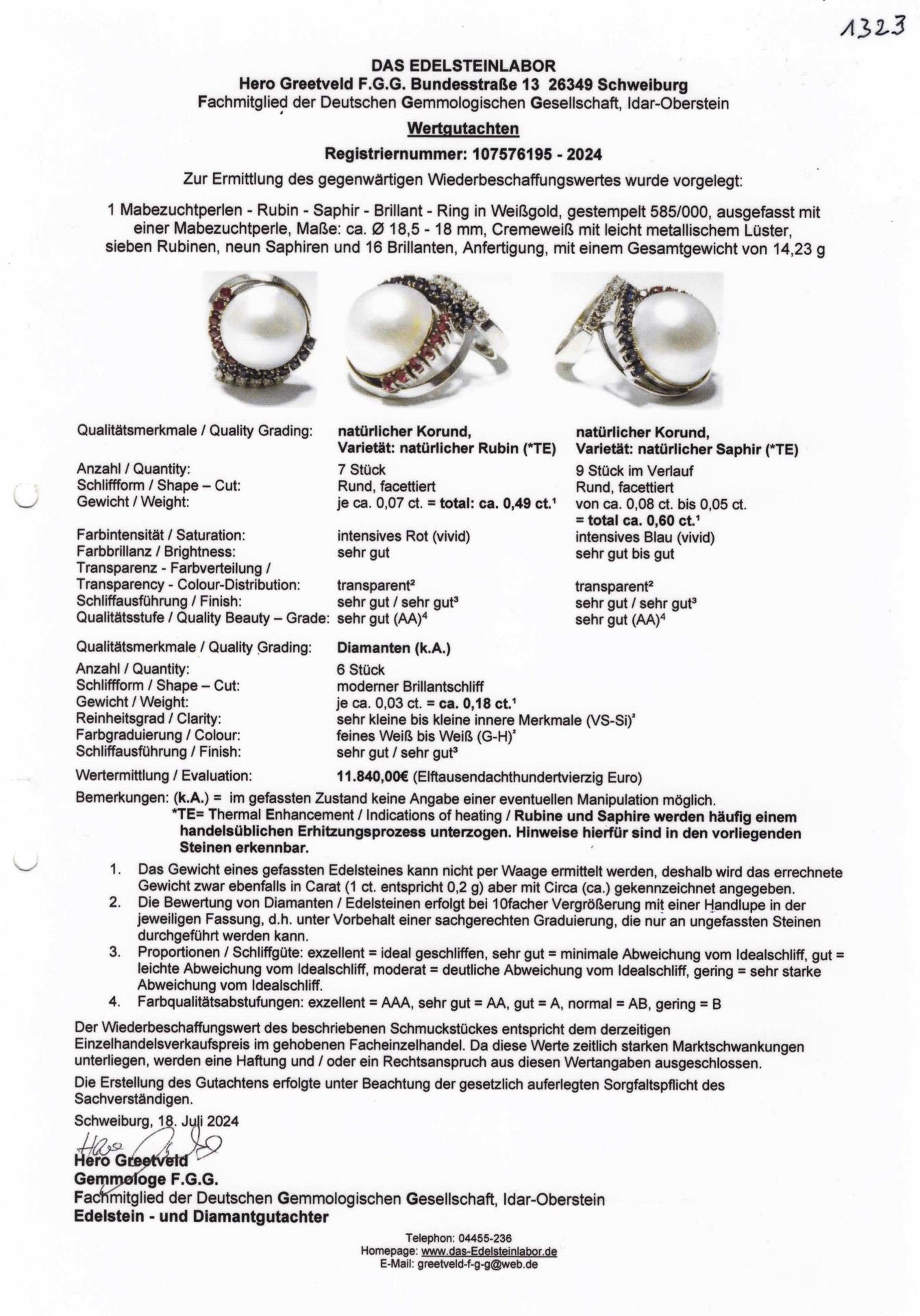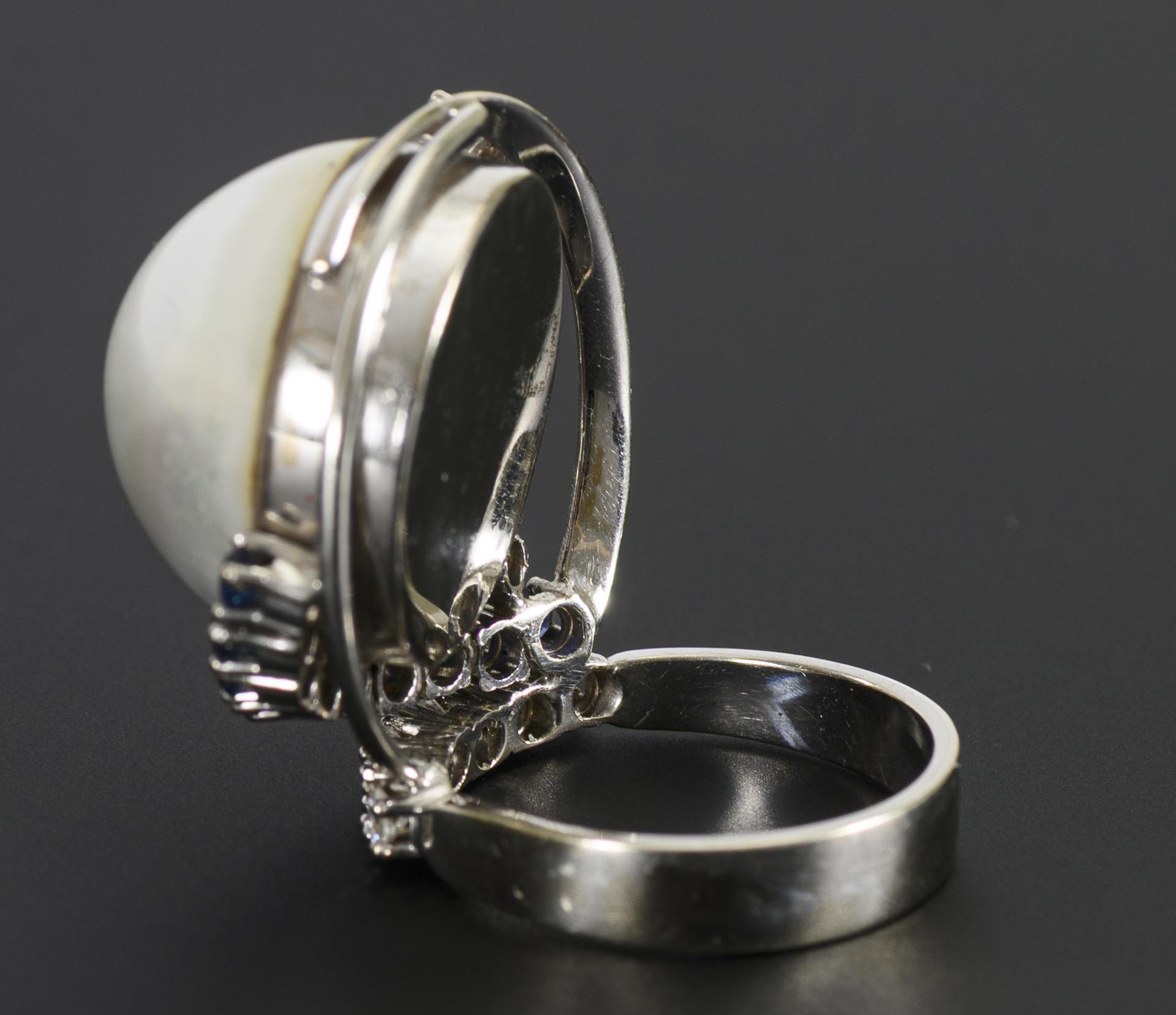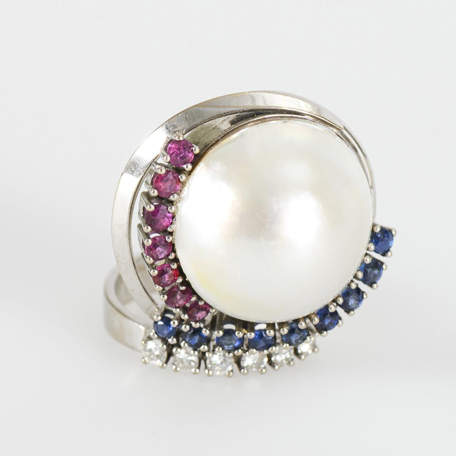 Weißgold 585 gestempelt. Ringgröße 54, Durchmesser der Mabé-Zuchtperle ca. 18,0-18,50 mm, die Rubine (farbverbessert) zusammen ca. 0,49 ct, die Saphire (farbverbessert) zusammen ca. 0,60 ct, die Brillanten zusammen ca. 0,18 ct/VS-Si/G-H. 14,23 g.