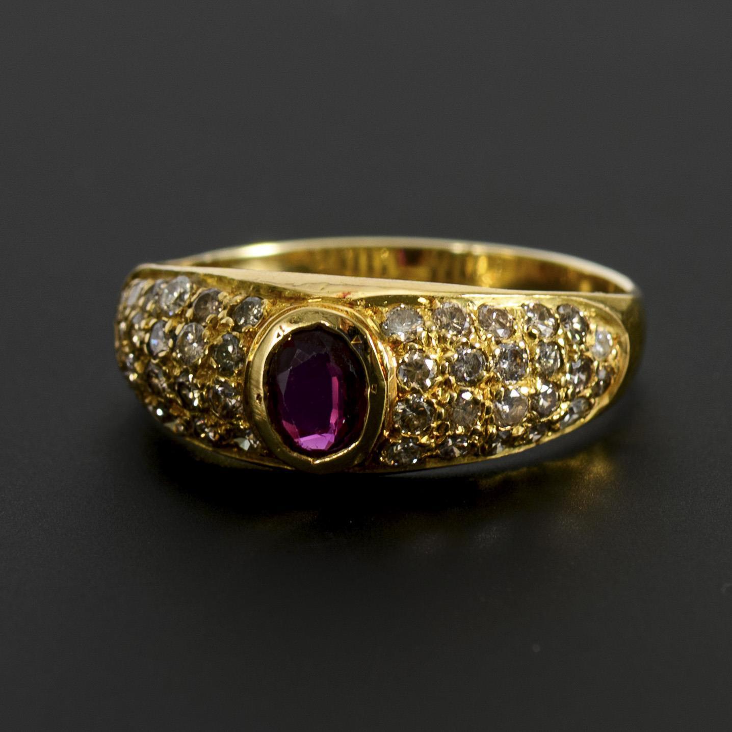 Großer Ring mit Brillanten und rotem Farbstein, wohl Rubin.