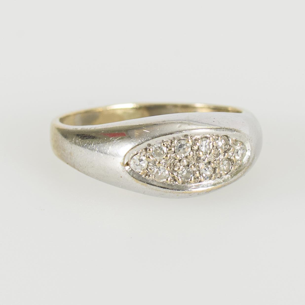 Ring mit sich verbreiterndem Ringkopf, dieser mit kleinen, im Oval pavégefassten Achtkant-Diamanten ausgefasst. Unterseitig mit leichten Tragespuren.