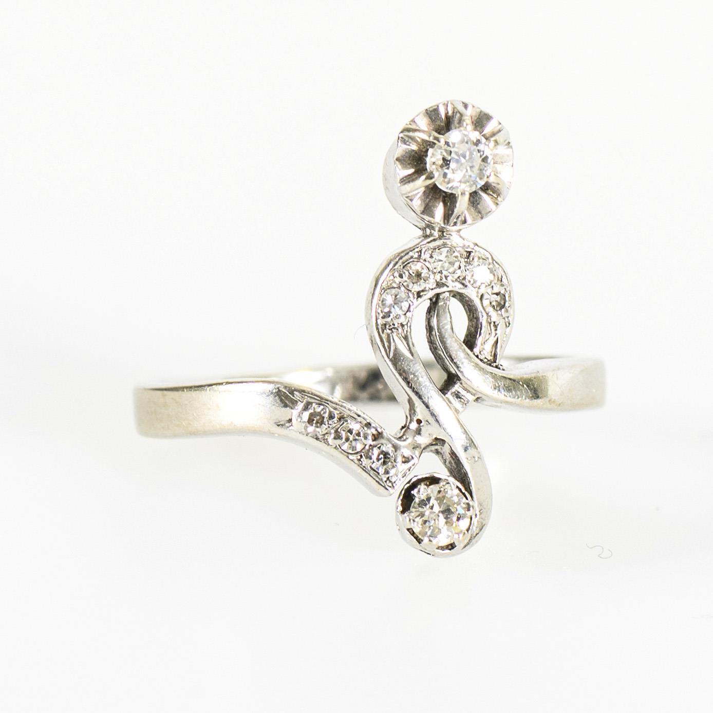 Ring mit ungewöhnlicher, knotenartig geschwungener Linienführung, besetzt mit kleinen, pavégefassten Achtkant-Diamanten sowie 2 chatongefassten Altschliff-Brillanten.