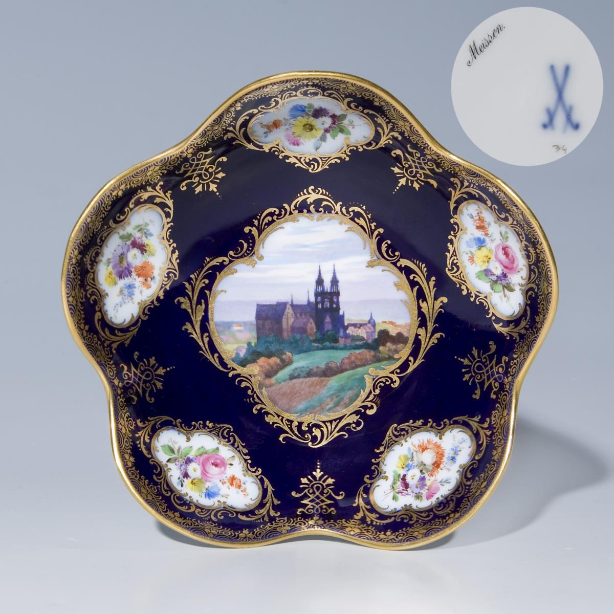 Umlaufend 4-Passig geschweifte Goldreserven mit feiner farbiger Bemalung. Dekor mit Blumen-Buketts. Im Spiegel farbige Ansichtenmalerei "Albrechtsburg in Meißen". Goldspitzenbordüren. Pressmarken, Malermarke, schwarzer Titel, Schwertermarke 1. Wahl.