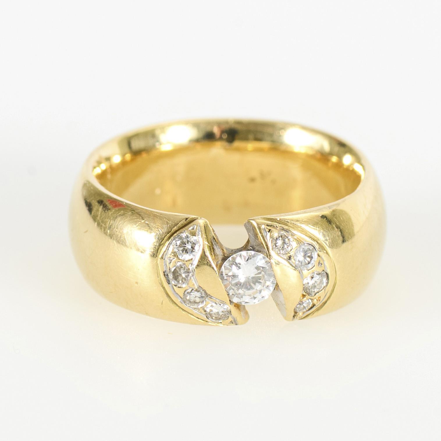 Breiter, schwerer Bandring mit einem zentralen Brillanten in Spannfassung, zu jeder Seite von vier kleineren, eingelassenen Brillanten eingerahmt. Vor allem unterseitig mit leichten Tragespuren.
