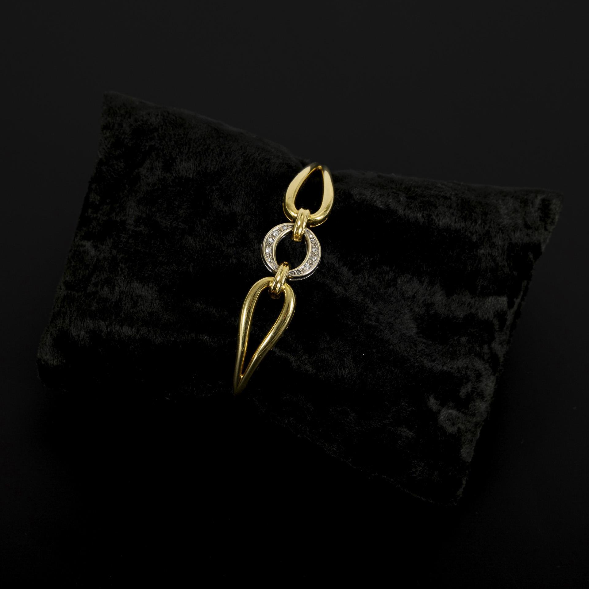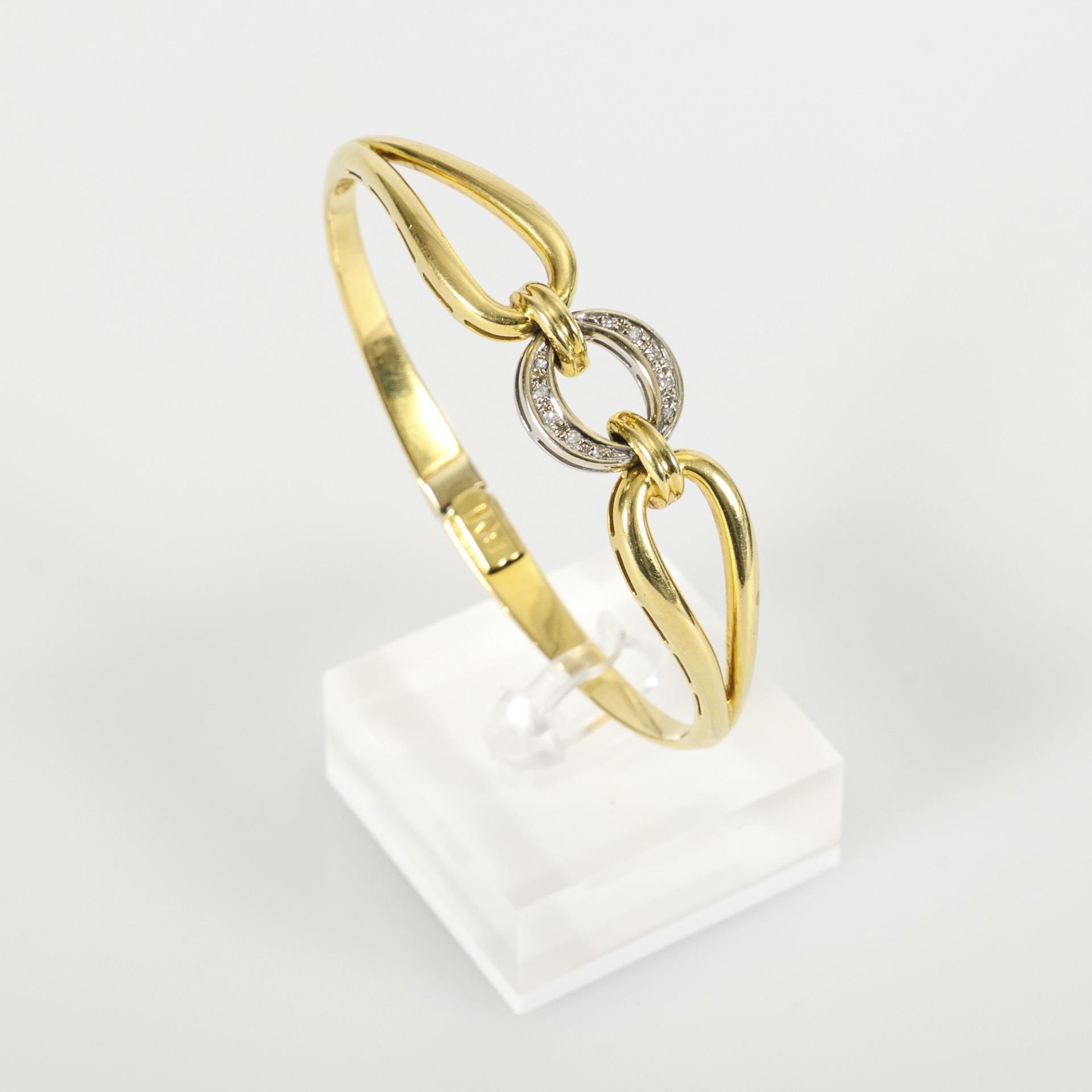 Zweifarbig gestalteter Armreif mit einem leicht beweglichen Mittelelement, dieses mit kleinen, pavégefassten Achtkant-Diamanten besetzt und durch 2 bewegliche Ringe mit den schlaufenartigen Reifelementen verbunden. Mit Kastenschloss. Tragespuren.