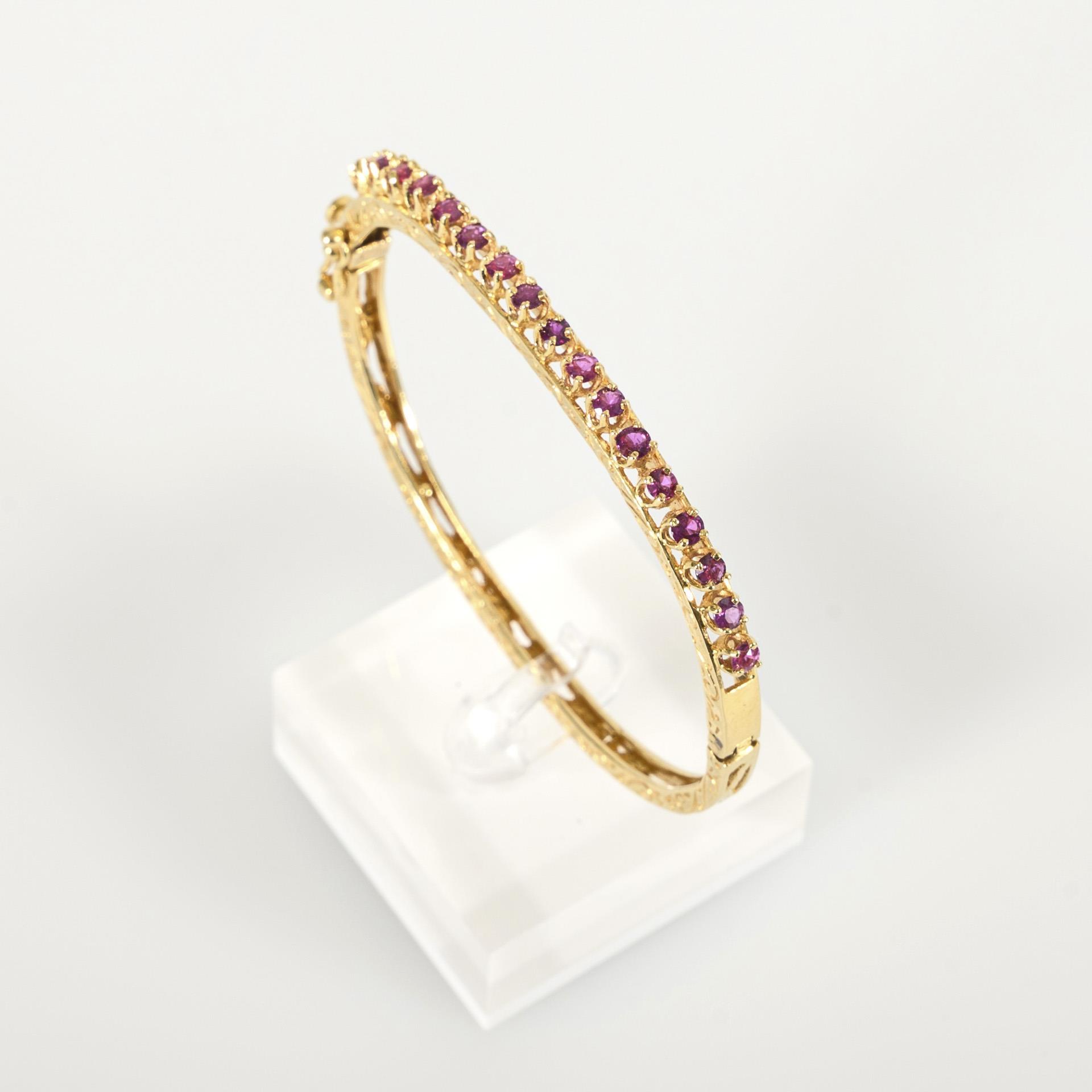 Armreif mit einem schauseitigen Besatz aus krappengefassten Rubinen. Der Reif seitlich umlaufend mit Ziergravuren. Das Kastenschloss mit einfacher Achtersicherung.