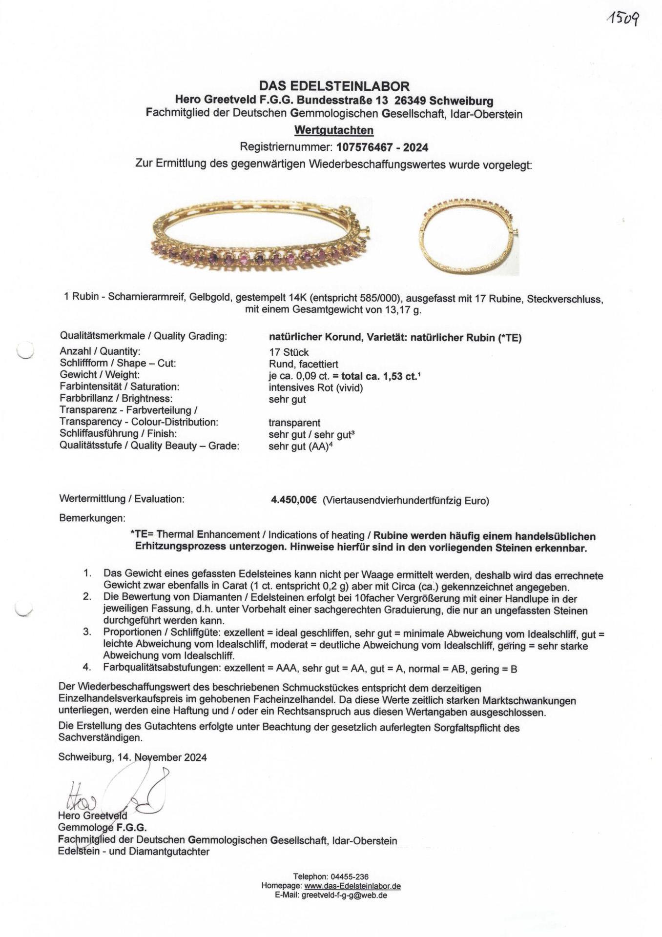 Roségold 14K (585) gestempelt. Innendurchmesser ca. 5,7 cm, Breite max. 4,22 mm, die Rubine zusammen ca. 1,53 ct. 13,2 g.