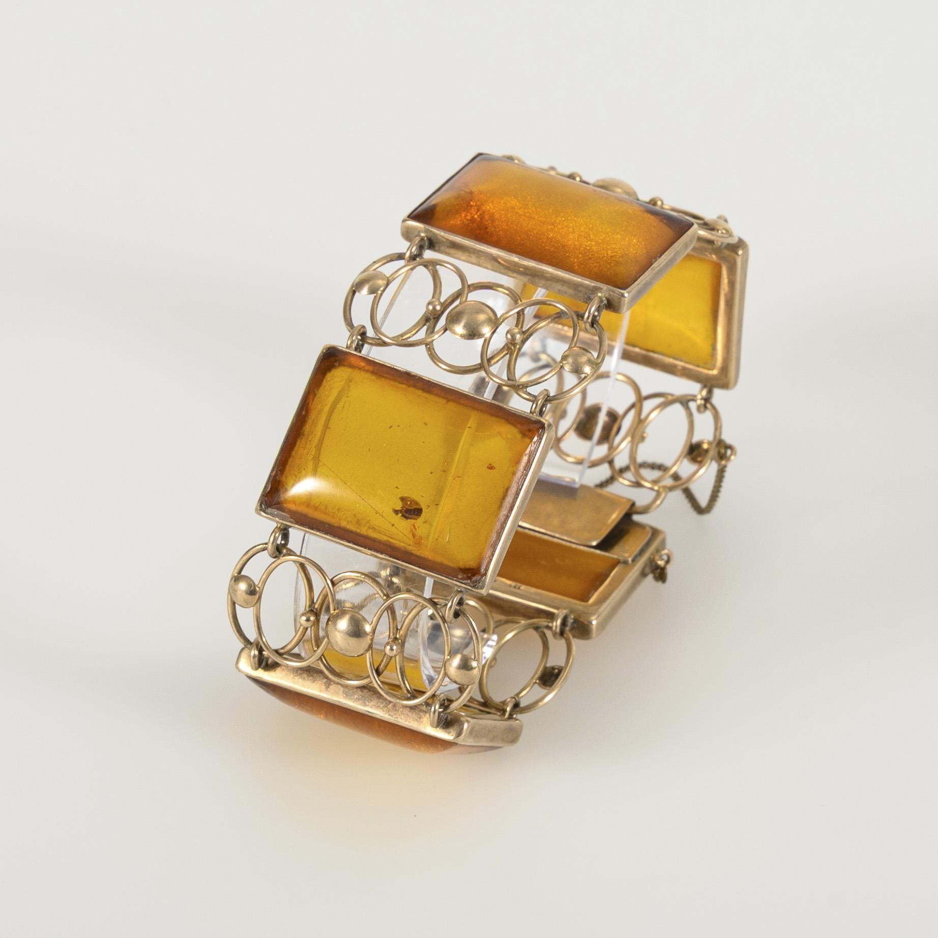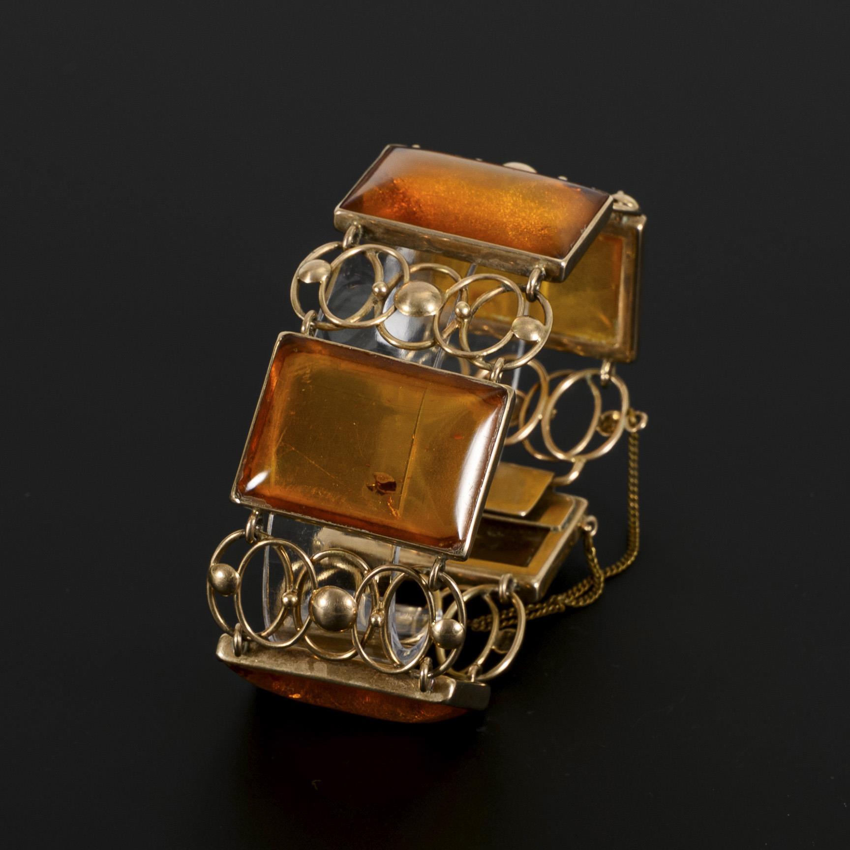 Armband mit großen Bernstein-Tafeln und elliptischen Zierelementen in Gold. Rückseitig an einer Tafel ein einfacher Verschluss zum Einhaken, dieser mit Sicherungskettchen. Tragespuren: einige Bernsteine mit kleineren Kratzern oder Chips.