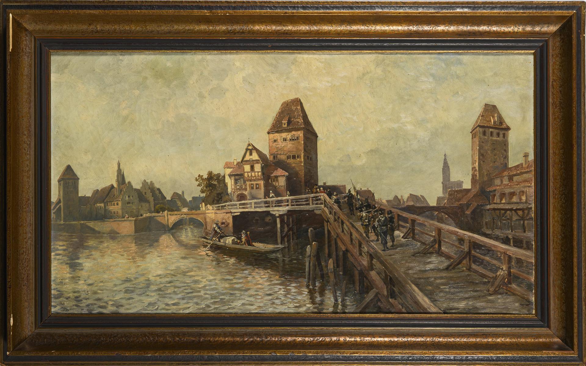 Die Truppen auf dem Laufsteg zur steinernen Brücke vor der Altstadt mit den Fachwerkhäusern. Altersspuren.