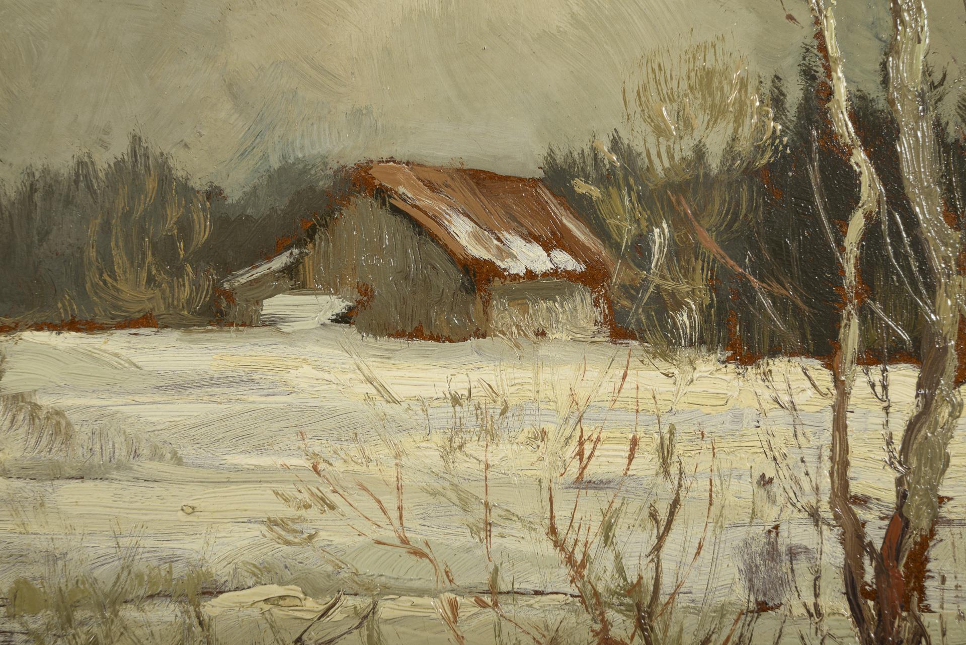Voralpenlandschaft mit Teich im Schnee unter grauem Himmel.