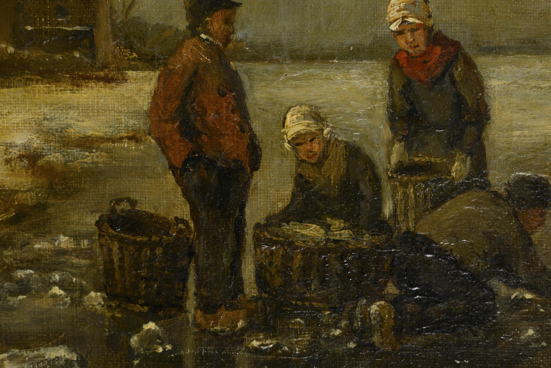 Mehrere Personen auf dem gefrorenen Fluss nahe den Dorfhäusern. Altersspuren.